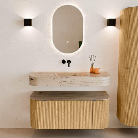 Matériaux naturels dans des tons chauds. Les nervures verticales apportent rythme et texture au design, tandis que le chêne confère une apparence chaleureuse et artisanale. Choisissez parmi 5 teintes de bois OAK, WALNUT, DUSK, SHADOW et RUBY, des couleurs de bois soigneusement sélectionnées pour enrichir les salles de bains modernes et classiques.