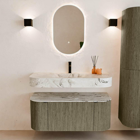 Au-dessus du meuble flotte une vasque suspendue assortie avec des coins arrondis – parfaitement adaptée à la forme du meuble. La vasque est réalisée en Solid Surface et suit subtilement les lignes du meuble inférieur, créant ainsi un ensemble harmonieux. Le plan de travail en Solid Surface forme une base solide et facile d'entretien et complète la combinaison.