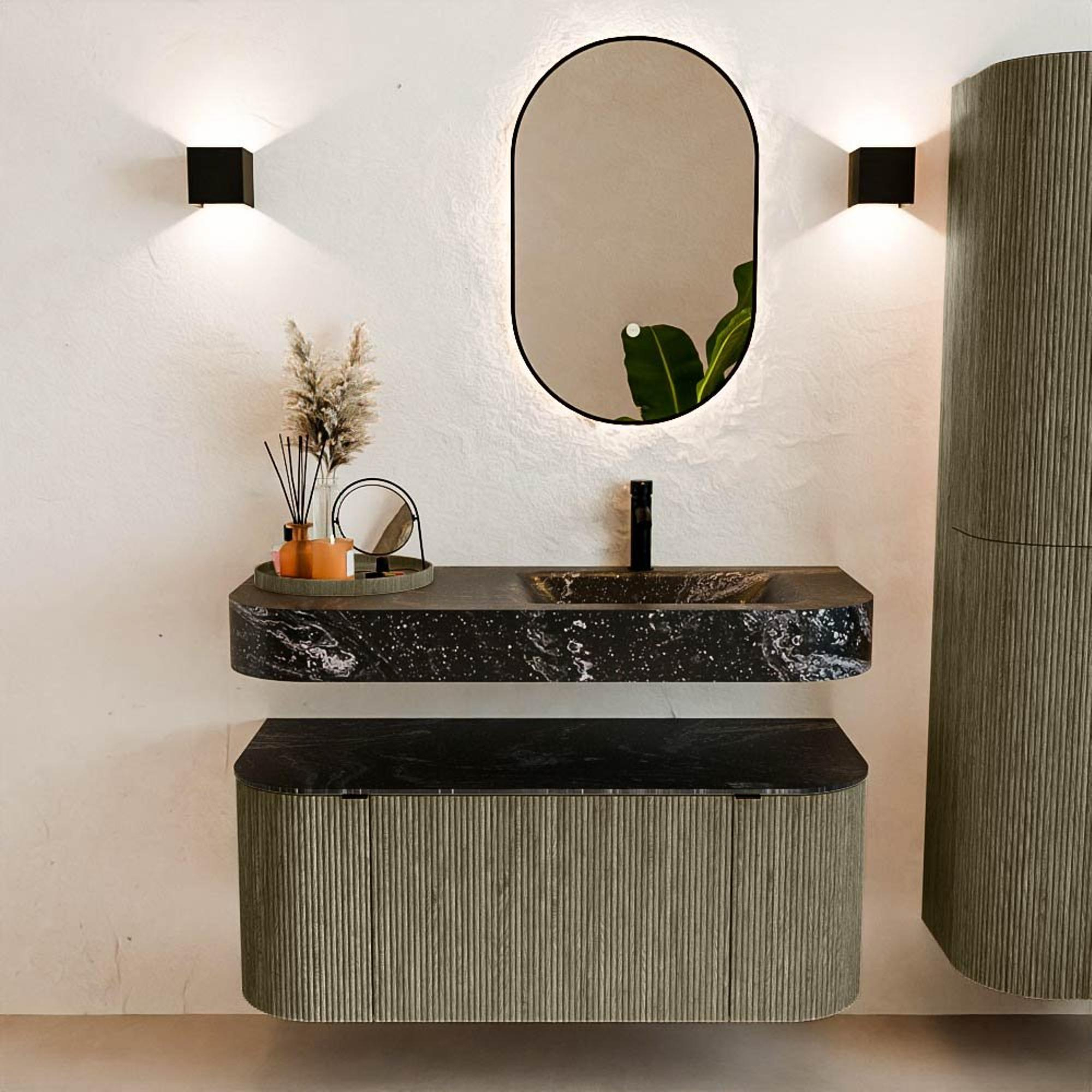 MONDIAZ THOR-DLUX 110cm meuble de salle de bains arrondi gauche + droite couleur Shadow avec 1 tiroir et 2 portes. Vasque suspendue CLOUD Droite 1 trou de robinet couleur Lava.