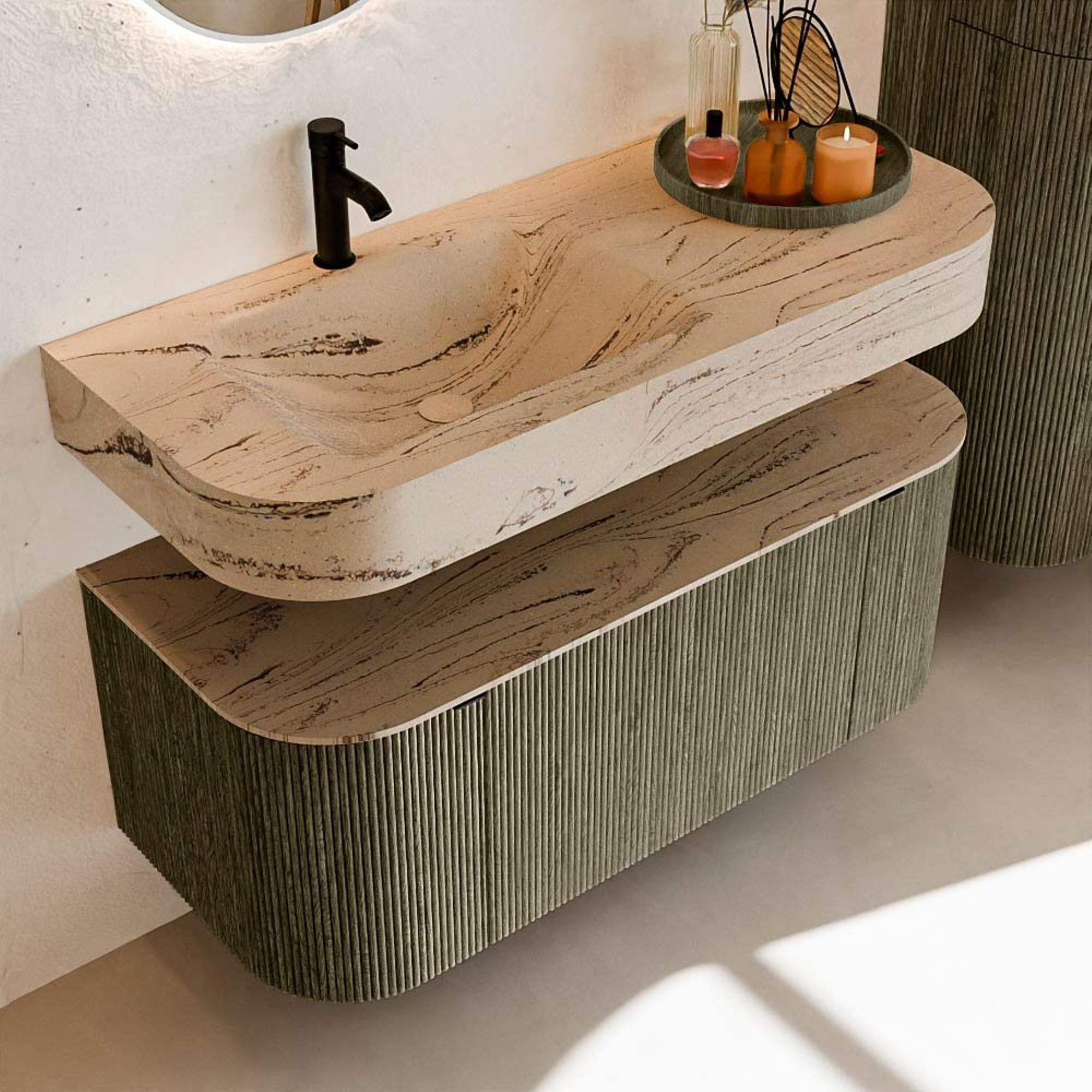Au-dessus du meuble flotte une vasque suspendue assortie aux coins arrondis – parfaitement adaptée à la forme du meuble. La vasque est réalisée en Solid Surface et suit subtilement les lignes du meuble inférieur, créant ainsi un ensemble harmonieux. Le plan de travail en Solid Surface forme une base solide et facile d’entretien et complète la combinaison.