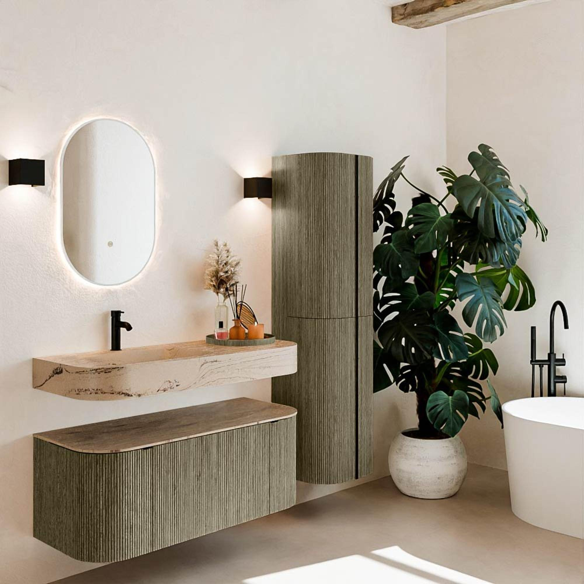 Matériaux naturels dans des tons chauds. Les nervures verticales apportent rythme et texture au design, tandis que le chêne confère une apparence chaleureuse et artisanale. Choisissez parmi 5 teintes de bois OAK, WALNUT, DUSK, SHADOW et RUBY, des couleurs de bois soigneusement sélectionnées pour enrichir les salles de bains modernes et classiques.