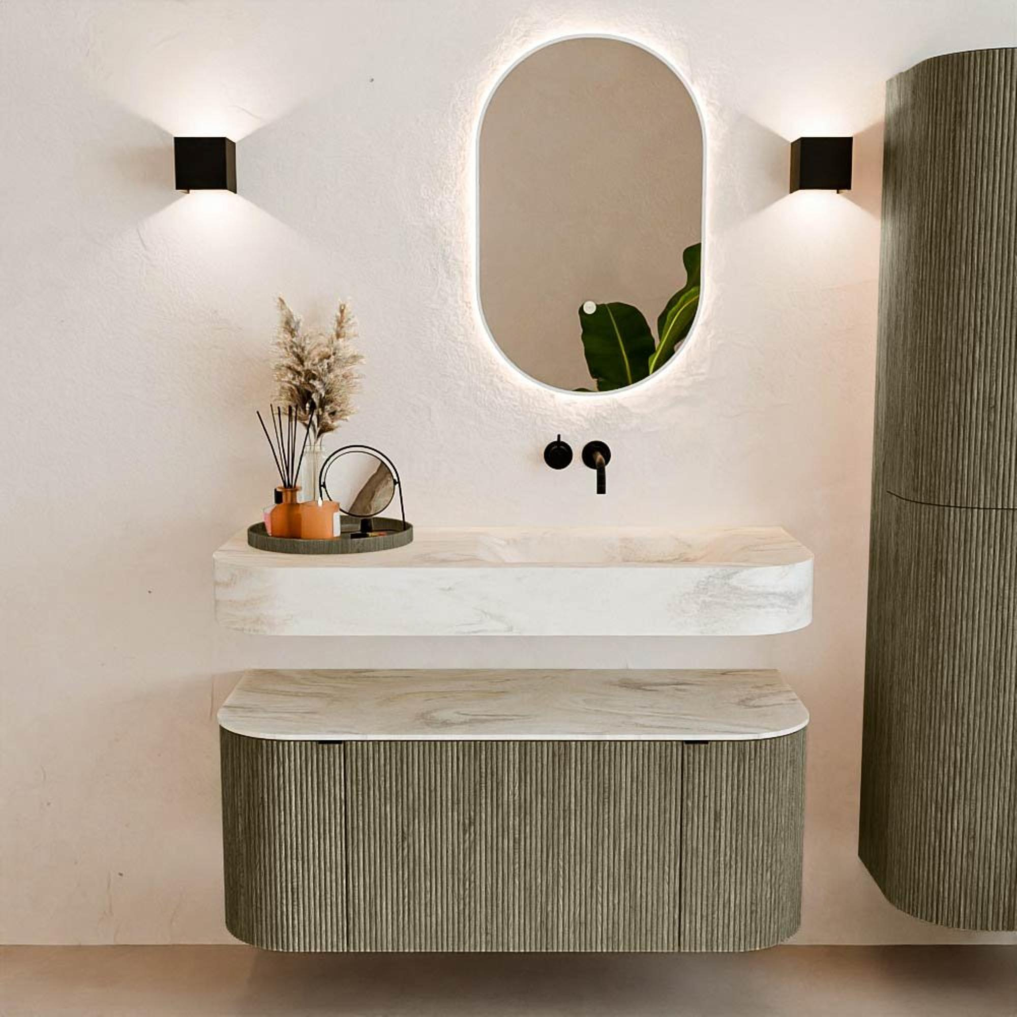 Matériaux naturels dans des tons chauds. Les rainures verticales apportent rythme et texture au design, tandis que le chêne confère une apparence chaleureuse et artisanale. Choisissez parmi 5 teintes de bois OAK, WALNUT, DUSK, SHADOW et RUBY, des couleurs de bois soigneusement sélectionnées pour enrichir les salles de bains modernes et classiques.