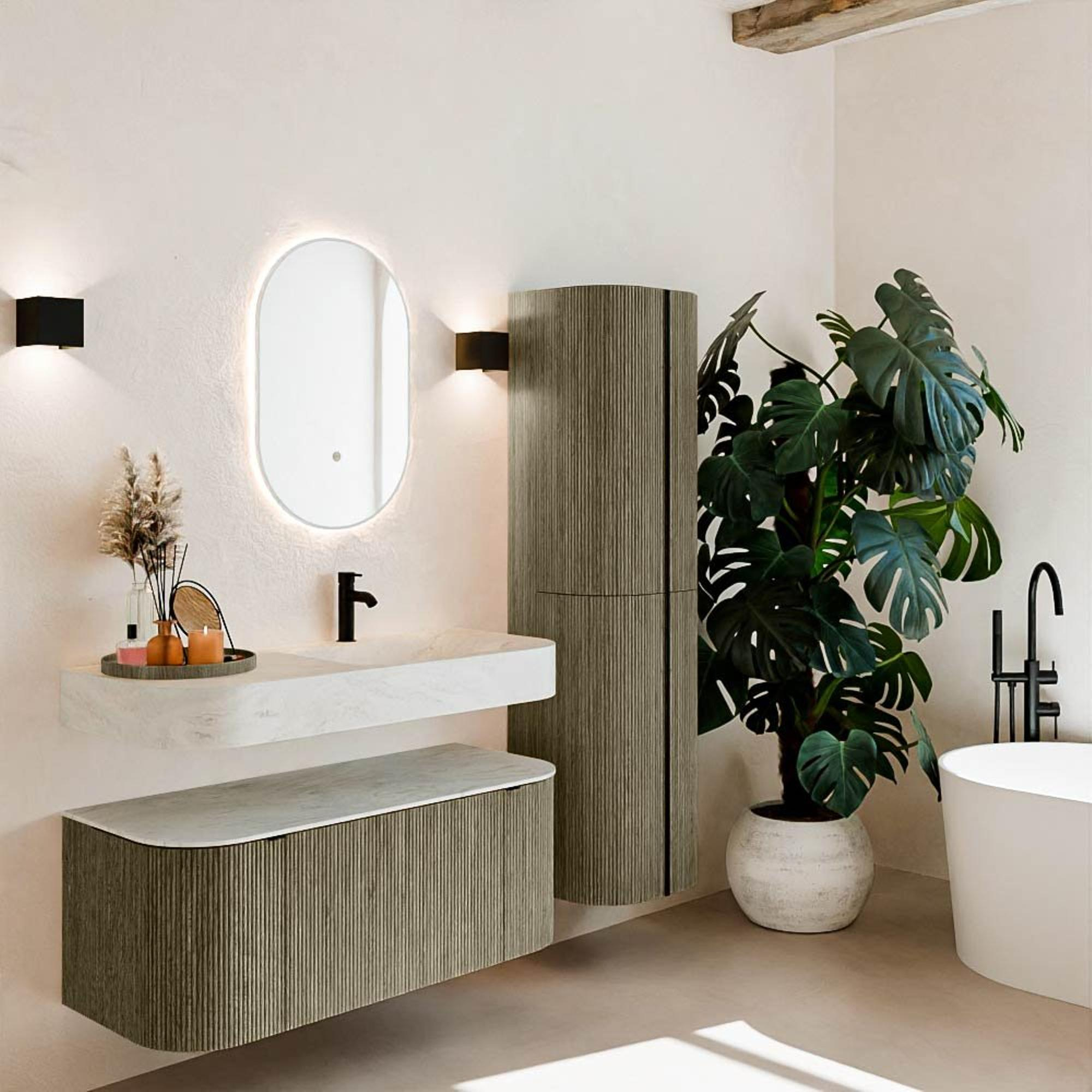 Matériaux naturels dans des tons chauds. Les rainures verticales apportent rythme et texture au design, tandis que le chêne confère une apparence chaleureuse et artisanale. Choisissez parmi 5 teintes de bois OAK, WALNUT, DUSK, SHADOW et RUBY, des couleurs de bois soigneusement sélectionnées pour enrichir les salles de bains modernes et classiques.