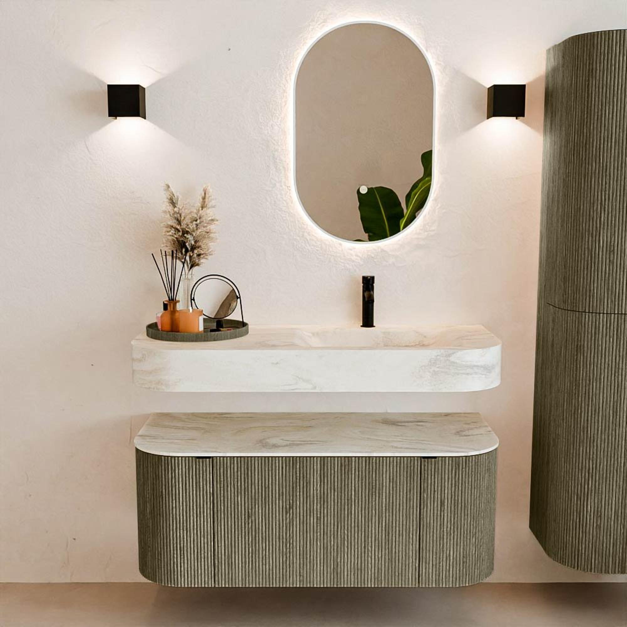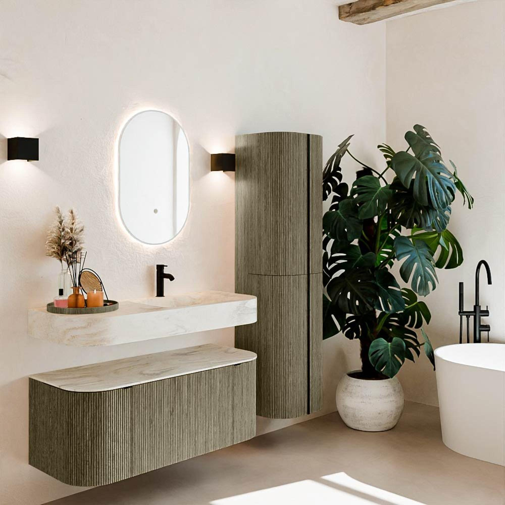 Matériaux naturels dans des tons chauds. Les cannelures verticales apportent rythme et texture au design, tandis que le chêne confère une apparence chaleureuse et artisanale. Choisissez parmi 5 teintes de bois OAK, WALNUT, DUSK, SHADOW et RUBY, des couleurs de bois soigneusement sélectionnées pour enrichir les salles de bains modernes et classiques.