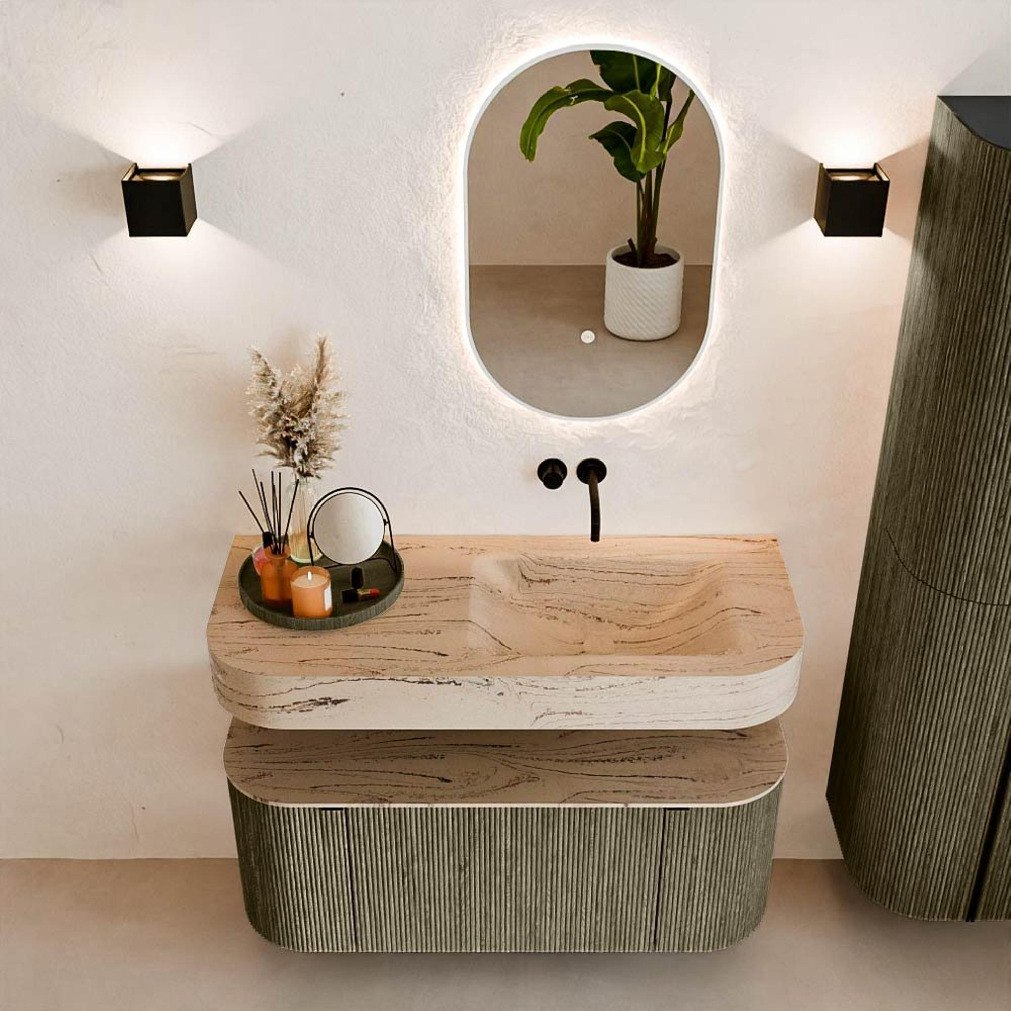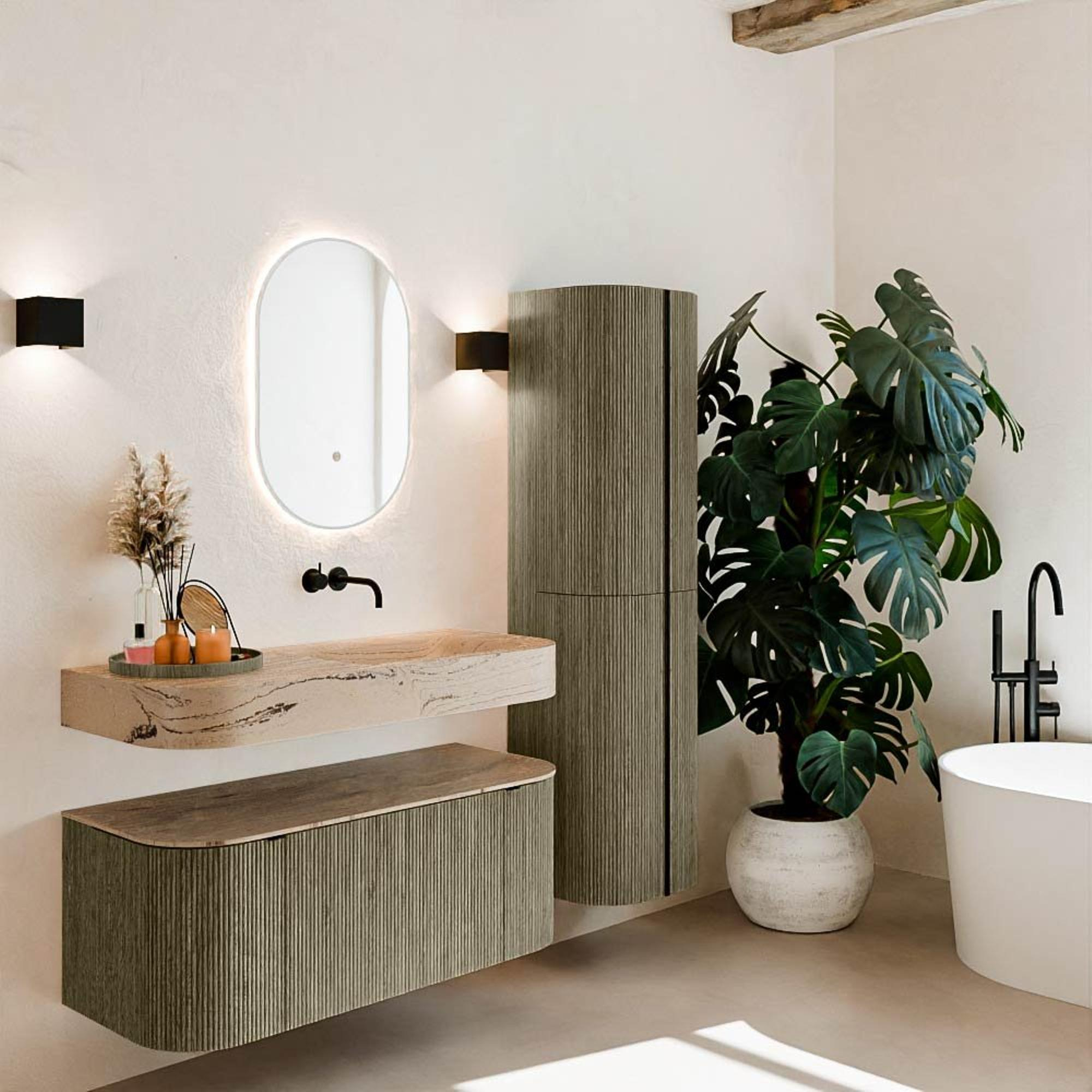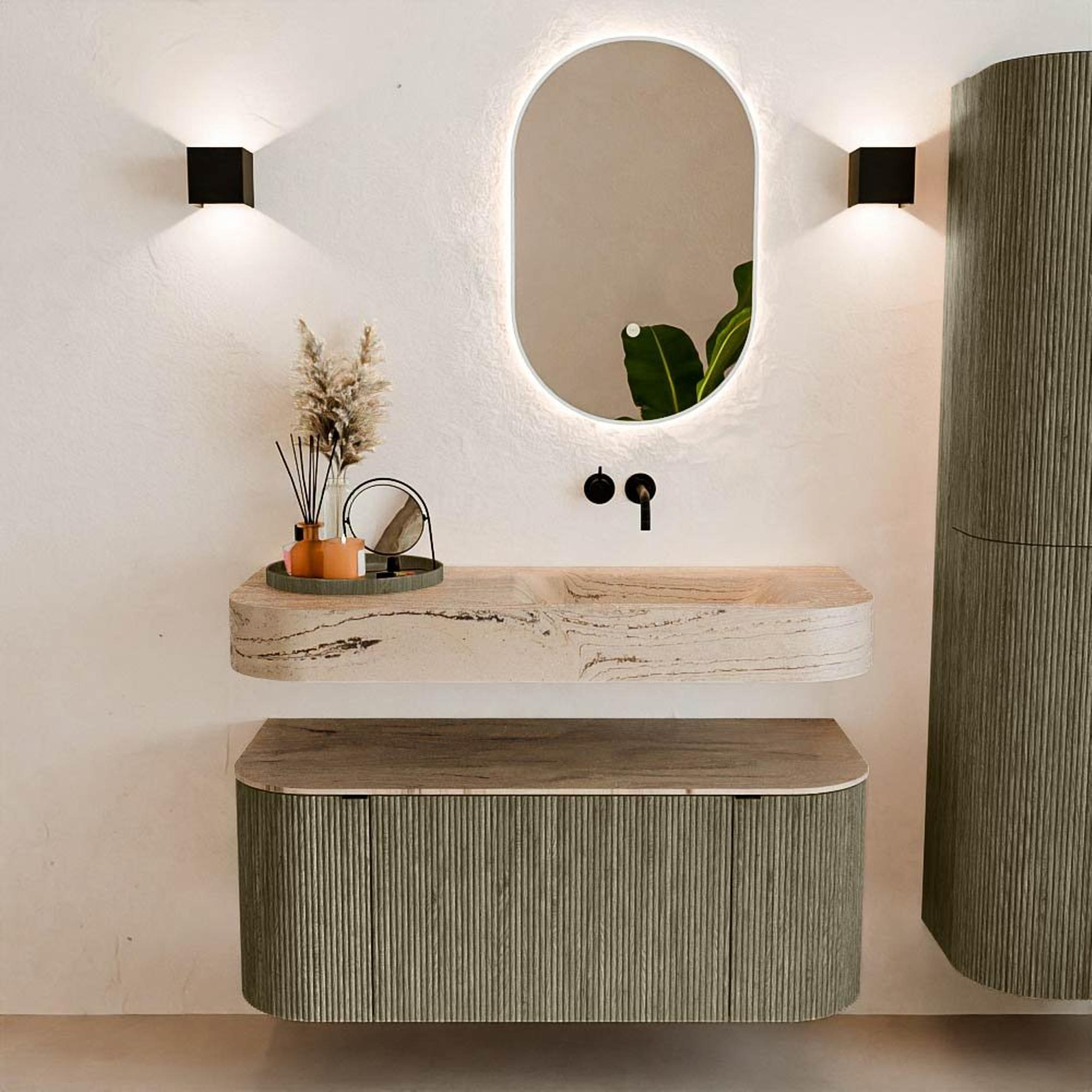 Matériaux naturels dans des tons chauds. Les nervures verticales apportent rythme et texture au design, tandis que le chêne confère une apparence chaleureuse et artisanale. Choisissez parmi 5 teintes de bois OAK, WALNUT, DUSK, SHADOW et RUBY, des couleurs de bois soigneusement sélectionnées pour enrichir les salles de bains modernes et classiques.