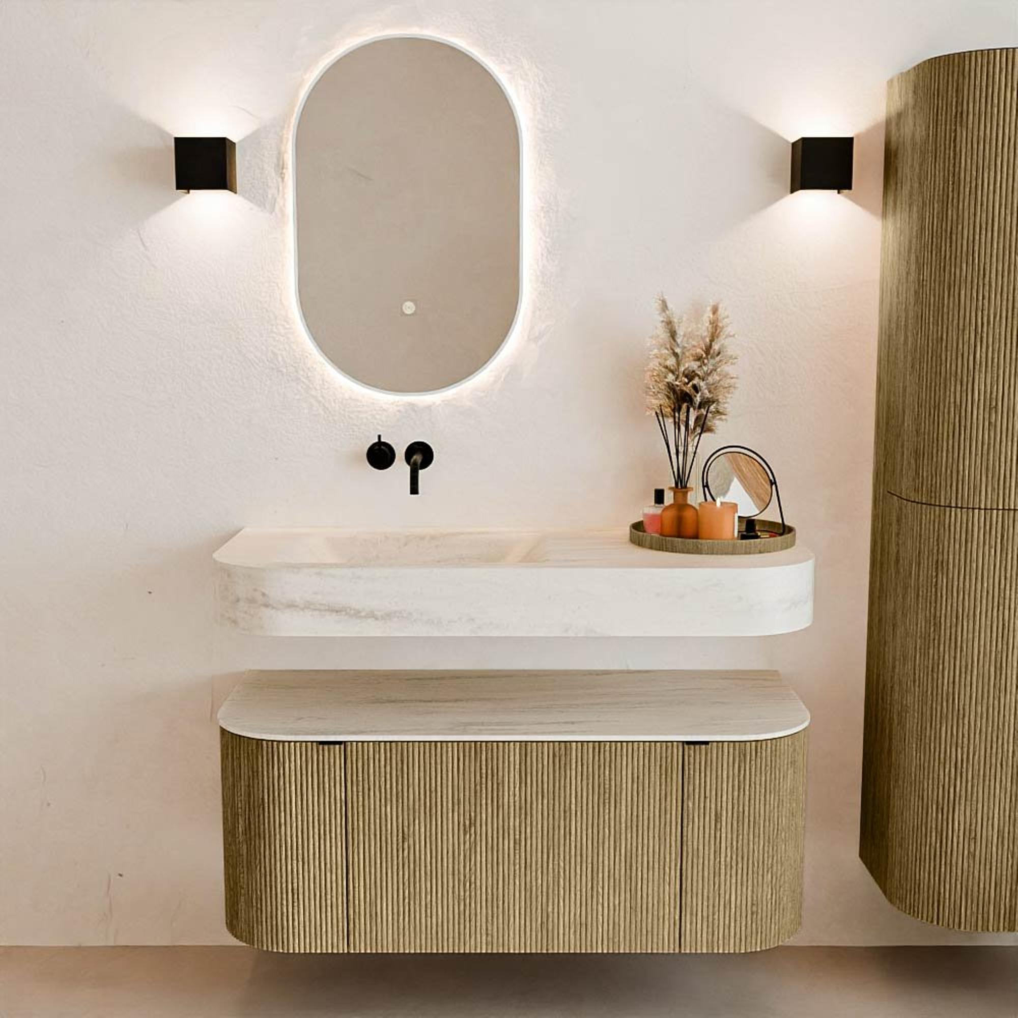 Matériaux naturels dans des tons chauds. Les nervures verticales apportent rythme et texture au design, tandis que le chêne confère une apparence chaleureuse et artisanale. Choisissez parmi 5 teintes de bois OAK, WALNUT, DUSK, SHADOW et RUBY, des couleurs de bois soigneusement sélectionnées pour enrichir les salles de bains modernes et classiques.
