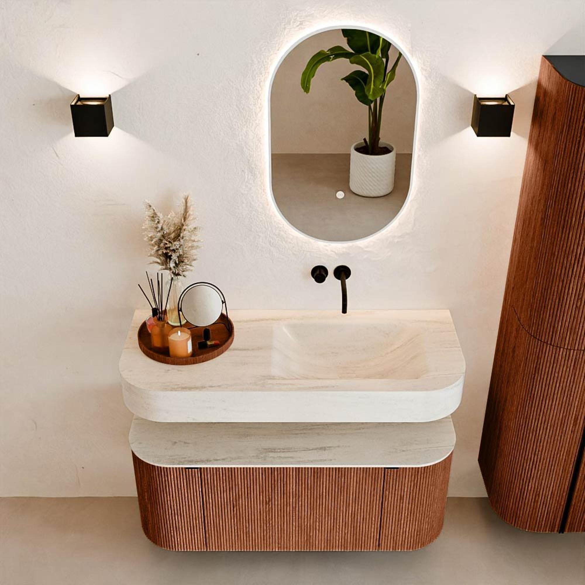 Matériaux naturels dans des tons chauds. Les rainures verticales apportent rythme et texture au design, tandis que le chêne confère une apparence chaleureuse et artisanale. Choisissez parmi 5 teintes de bois OAK, WALNUT, DUSK, SHADOW et RUBY, des couleurs de bois soigneusement sélectionnées pour enrichir les salles de bains modernes et classiques.