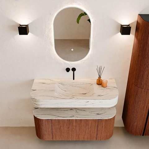 Matériaux naturels dans des tons chauds. Les nervures verticales apportent rythme et texture au design, tandis que le chêne confère une apparence chaleureuse et artisanale. Choisissez parmi 5 teintes de bois OAK, WALNUT, DUSK, SHADOW et RUBY, des couleurs de bois soigneusement sélectionnées pour enrichir les salles de bains modernes et classiques.