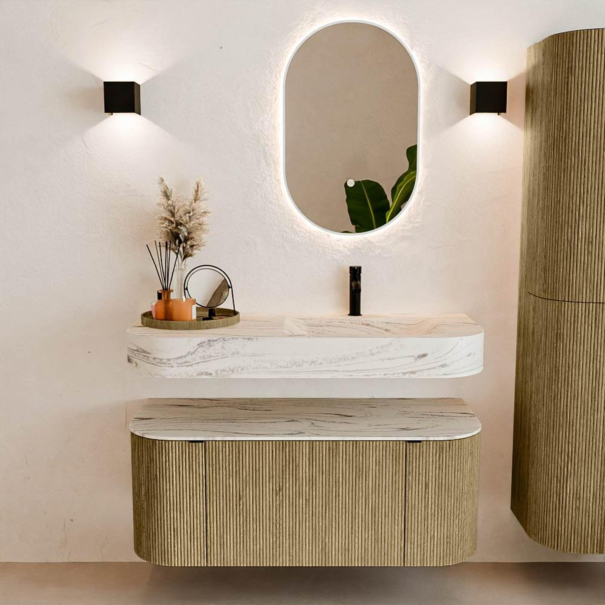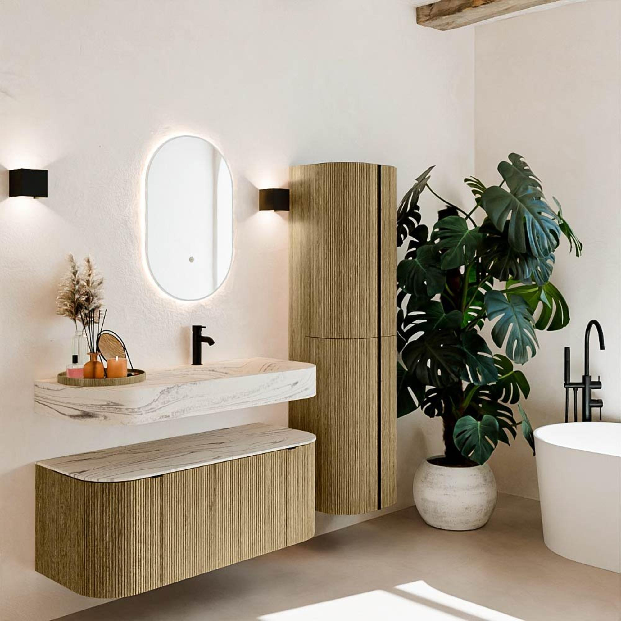 Matériaux naturels dans des tons chauds. Les cannelures verticales apportent rythme et texture au design, tandis que le chêne confère une apparence chaleureuse et artisanale. Choisissez parmi 5 teintes de bois OAK, WALNUT, DUSK, SHADOW et RUBY, des couleurs de bois soigneusement sélectionnées pour enrichir les salles de bains modernes et classiques.