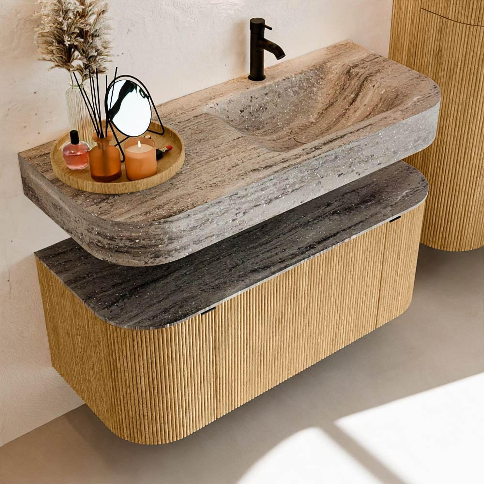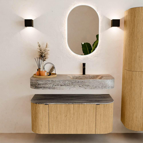 Matériaux naturels dans des tons chauds. Les nervures verticales apportent rythme et texture au design, tandis que le chêne confère une apparence chaleureuse et artisanale. Choisissez parmi 5 teintes de bois OAK, WALNUT, DUSK, SHADOW et RUBY, des couleurs de bois soigneusement sélectionnées pour enrichir les salles de bains modernes et classiques.