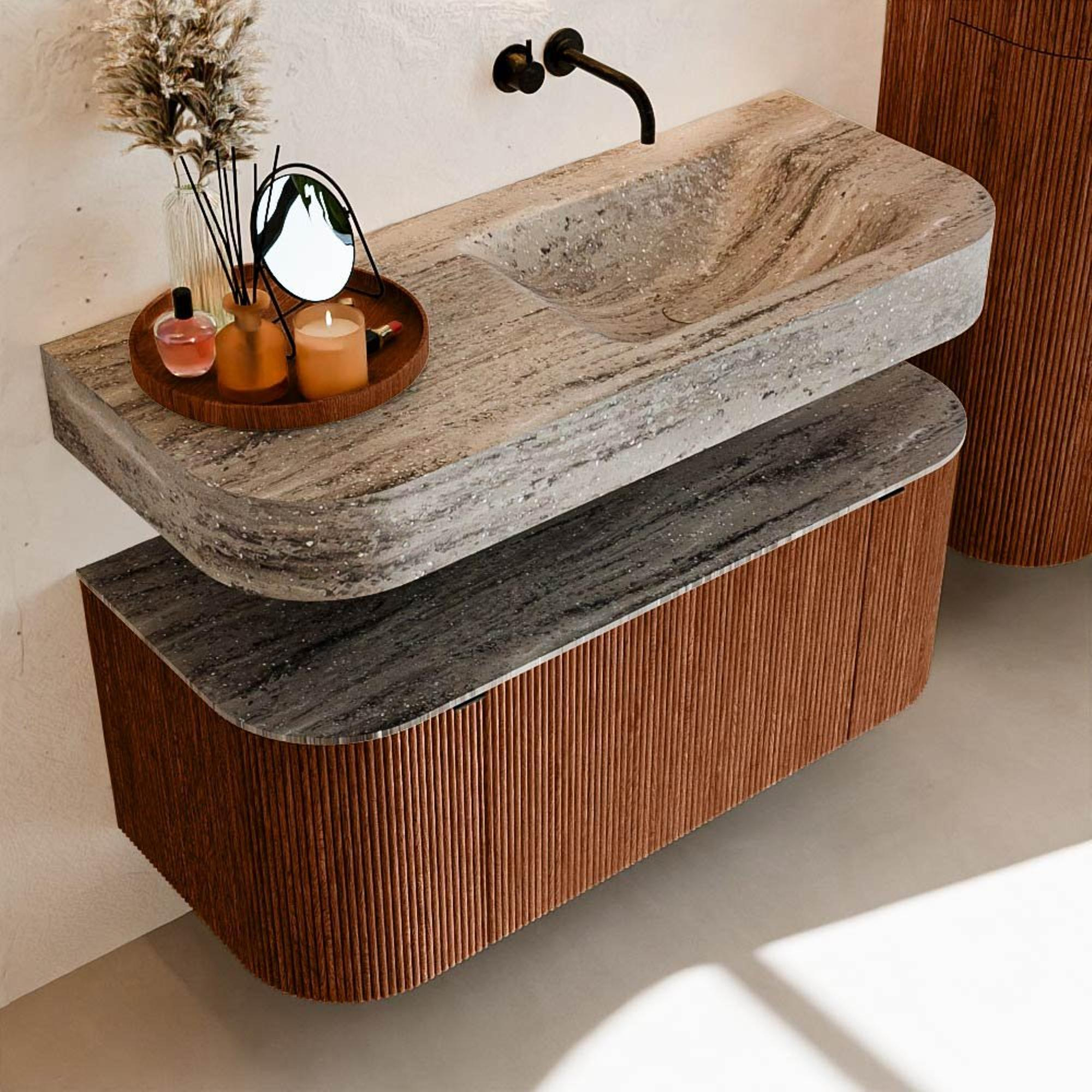 Matériaux naturels dans des tons chauds. Les rainures verticales apportent rythme et texture au design, tandis que le chêne confère une apparence chaleureuse et artisanale. Choisissez parmi 5 teintes de bois OAK, WALNUT, DUSK, SHADOW et RUBY, des couleurs de bois soigneusement sélectionnées pour enrichir les salles de bains modernes et classiques.