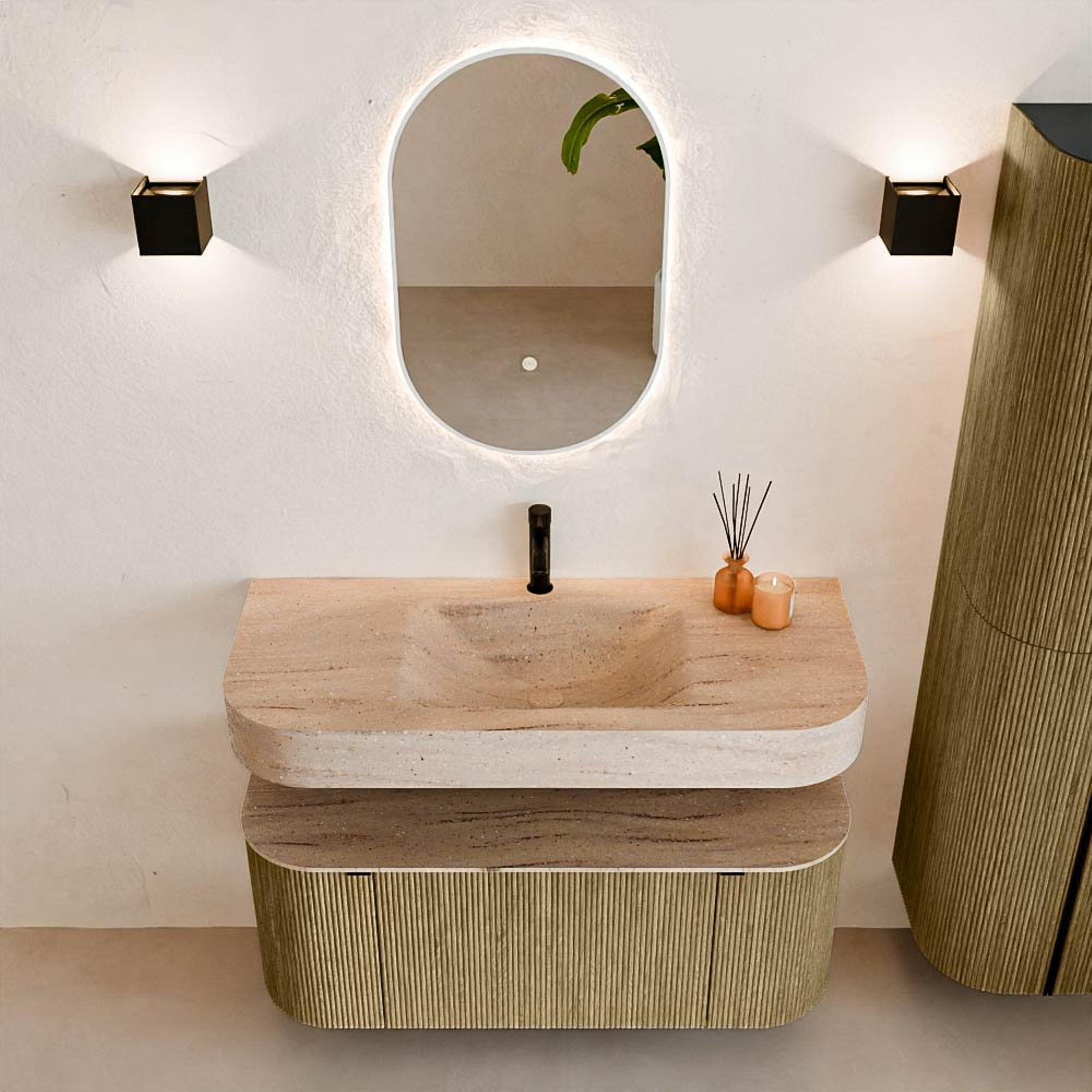 Matériaux naturels dans des tons chauds. Les nervures verticales apportent rythme et texture au design, tandis que le chêne confère une apparence chaleureuse et artisanale. Choisissez parmi 5 teintes de bois OAK, WALNUT, DUSK, SHADOW et RUBY, des couleurs de bois soigneusement sélectionnées pour enrichir les salles de bains modernes et classiques.