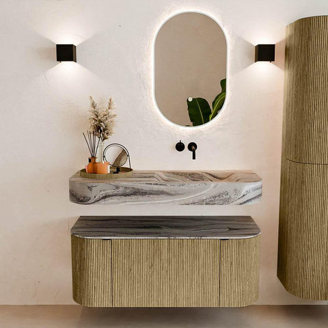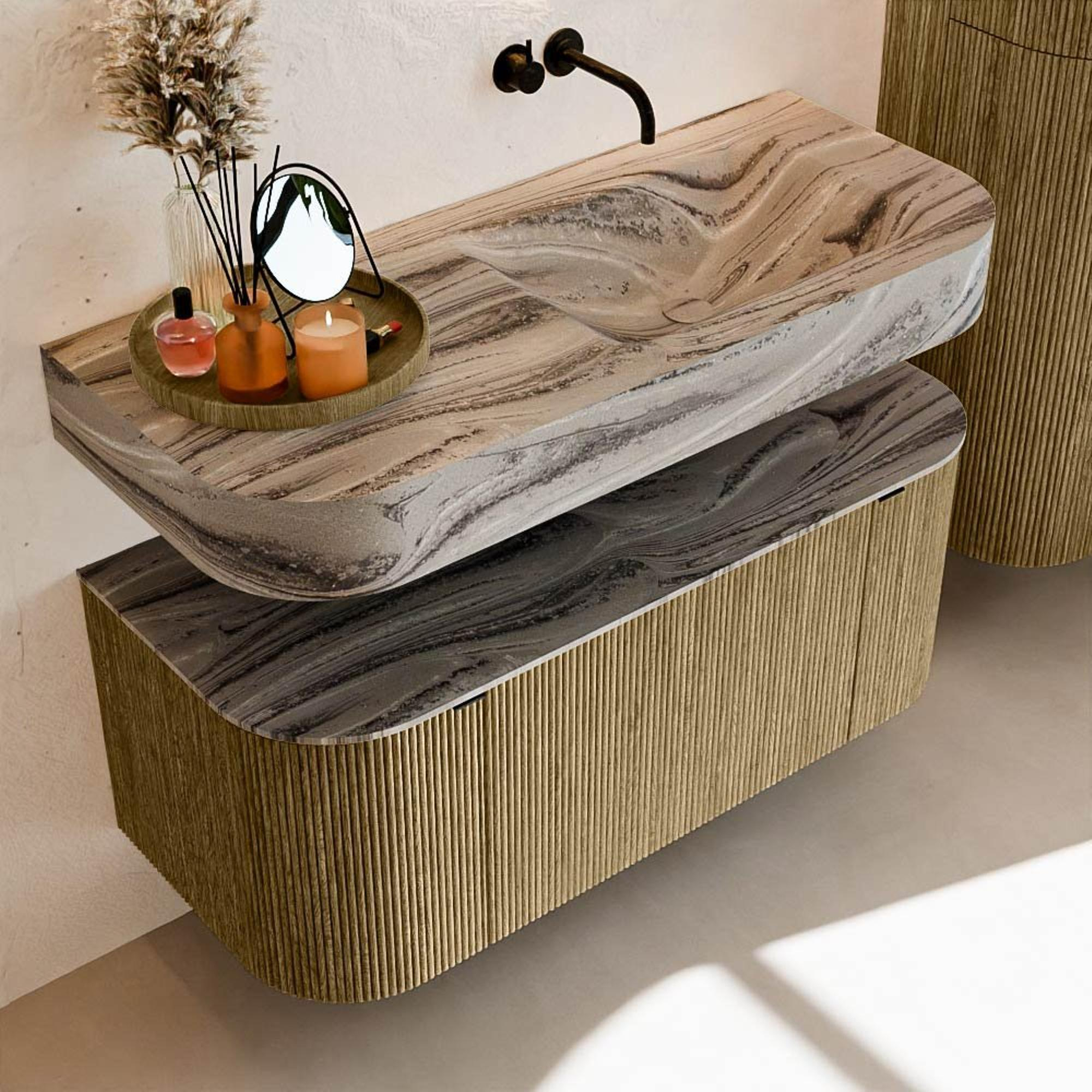 Matériaux naturels dans des tons chauds. Les nervures verticales apportent rythme et texture au design, tandis que le chêne confère une apparence chaleureuse et artisanale. Choisissez parmi 5 teintes de bois OAK, WALNUT, DUSK, SHADOW et RUBY, des couleurs de bois soigneusement sélectionnées pour enrichir les salles de bains modernes et classiques.