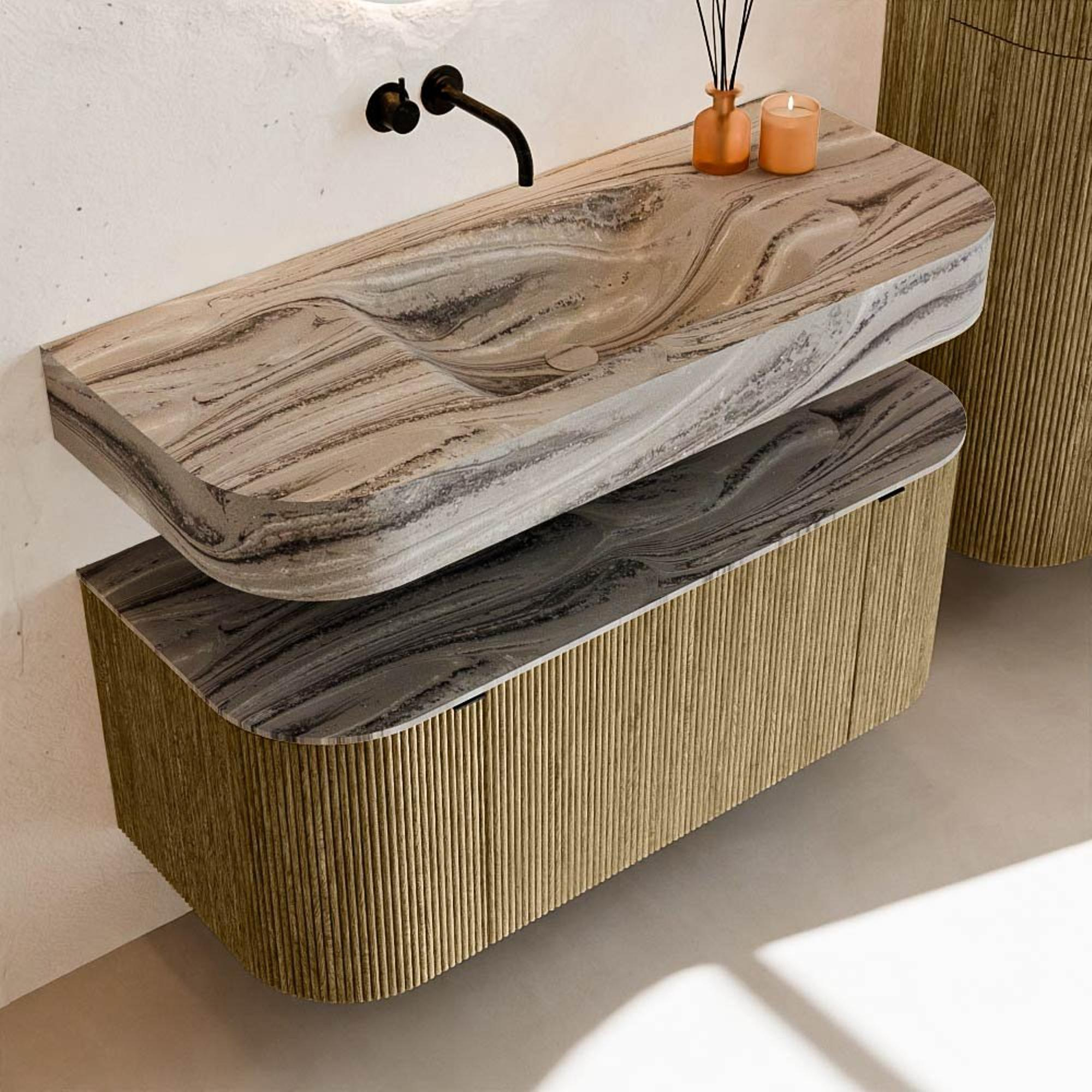 Matériaux naturels dans des tons chauds. Les nervures verticales apportent rythme et texture au design, tandis que le chêne confère une apparence chaleureuse et artisanale. Choisissez parmi 5 teintes de bois OAK, WALNUT, DUSK, SHADOW et RUBY, des couleurs de bois soigneusement sélectionnées pour enrichir les salles de bains modernes et classiques.