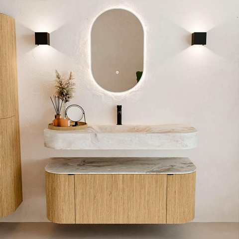 Au-dessus du meuble flotte une vasque suspendue assortie aux coins arrondis – parfaitement adaptée à la forme du meuble. La vasque est réalisée en Solid Surface et suit subtilement les lignes du meuble inférieur, créant un ensemble harmonieux. Le plan de travail en Solid Surface forme une base solide et facile d'entretien et complète la combinaison.