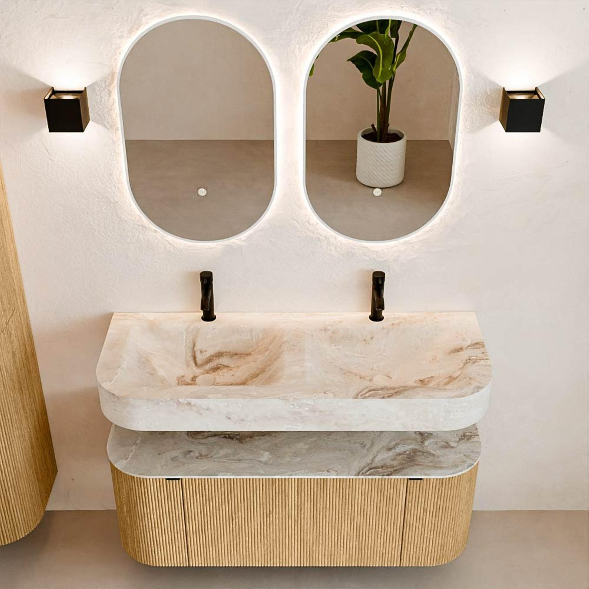 Matériaux naturels dans des tons chauds. Les cannelures verticales apportent rythme et texture au design, tandis que le chêne confère une apparence chaleureuse et artisanale. Choisissez parmi 5 teintes de bois OAK, WALNUT, DUSK, SHADOW et RUBY, des couleurs de bois soigneusement sélectionnées pour enrichir les salles de bains modernes et classiques.