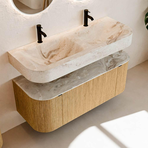 MONDIAZ THOR-DLUX 120cm meuble de salle de bains arrondi gauche + droite couleur Oak avec 1 tiroir et 2 portes. Vasque suspendue CLOUD Double 2 trous de robinet couleur Frappe.