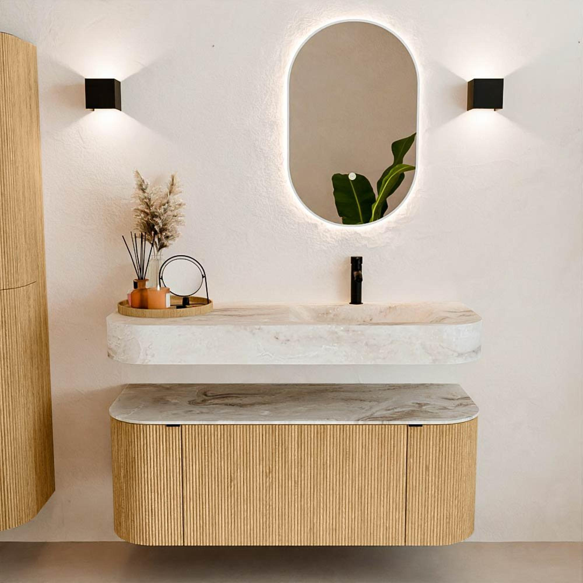 Matériaux naturels dans des tons chauds. Les nervures verticales apportent rythme et texture au design, tandis que le chêne confère une apparence chaleureuse et artisanale. Choisissez parmi 5 teintes de bois OAK, WALNUT, DUSK, SHADOW et RUBY, des couleurs de bois soigneusement sélectionnées pour enrichir les salles de bains modernes et classiques.