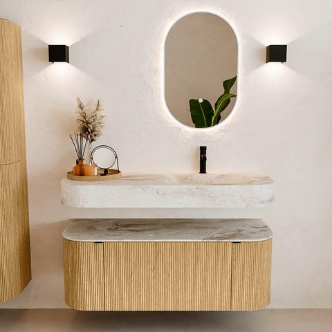 MONDIAZ THOR-DLUX Meuble de salle de bains 120cm arrondi gauche + droite couleur Oak avec 1 tiroir et 2 portes. Vasque suspendue CLOUD Droite 1 trou de robinet couleur Frappe.