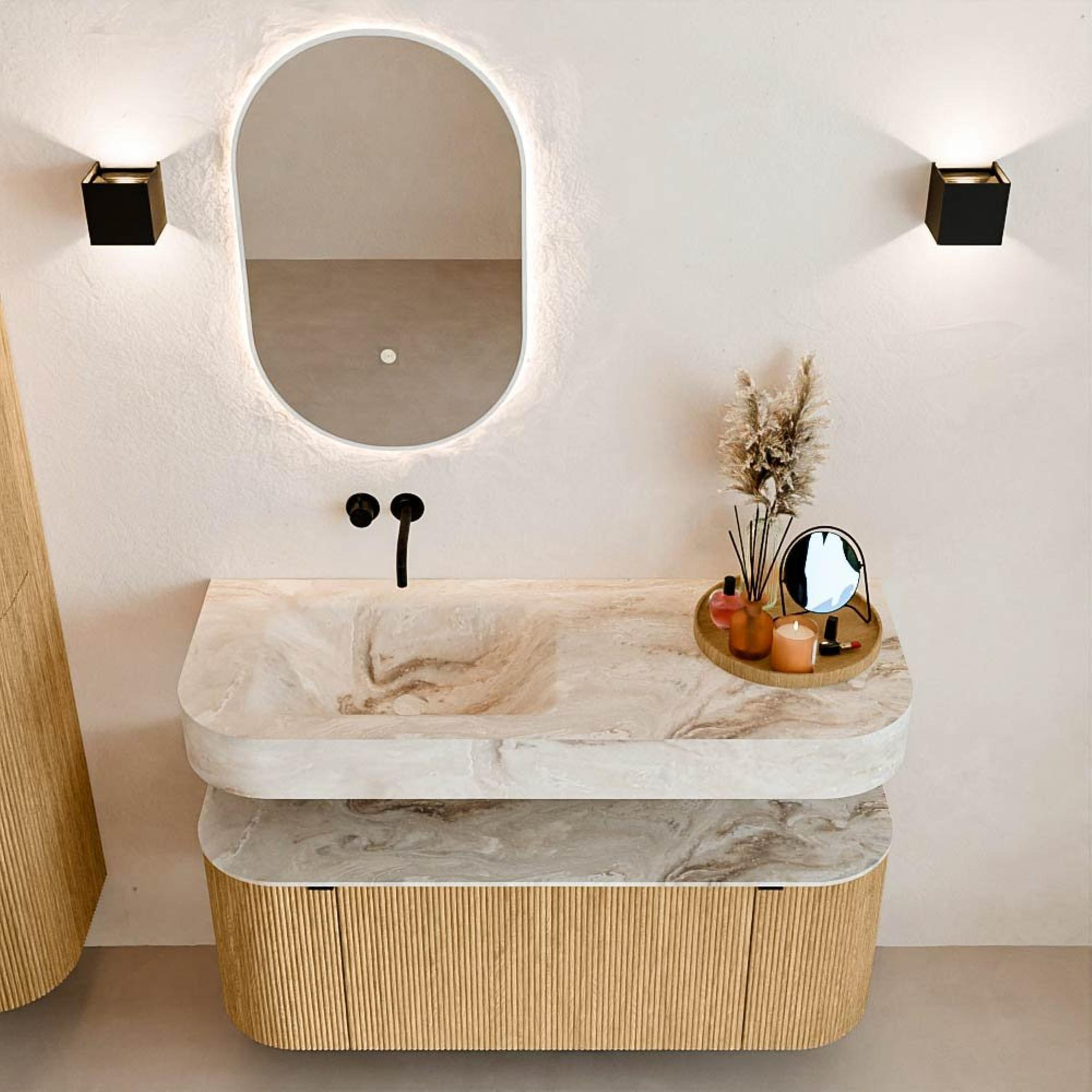 Matériaux naturels dans des tons chauds. Les nervures verticales apportent rythme et texture au design, tandis que le chêne confère une apparence chaleureuse et artisanale. Choisissez parmi 5 teintes de bois OAK, WALNUT, DUSK, SHADOW et RUBY, des couleurs de bois soigneusement sélectionnées pour enrichir les salles de bains modernes et classiques.