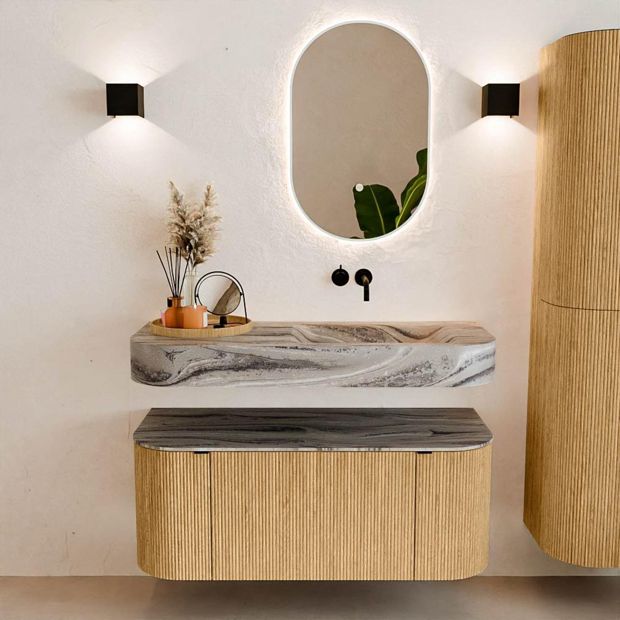 Matériaux naturels dans des tons chauds. Les cannelures verticales apportent rythme et texture au design, tandis que le chêne confère une apparence chaleureuse et artisanale. Choisissez parmi 5 teintes de bois CHÊNE, NOYER, DUSK, SHADOW et RUBY, des couleurs de bois soigneusement sélectionnées pour enrichir les salles de bains modernes et classiques.