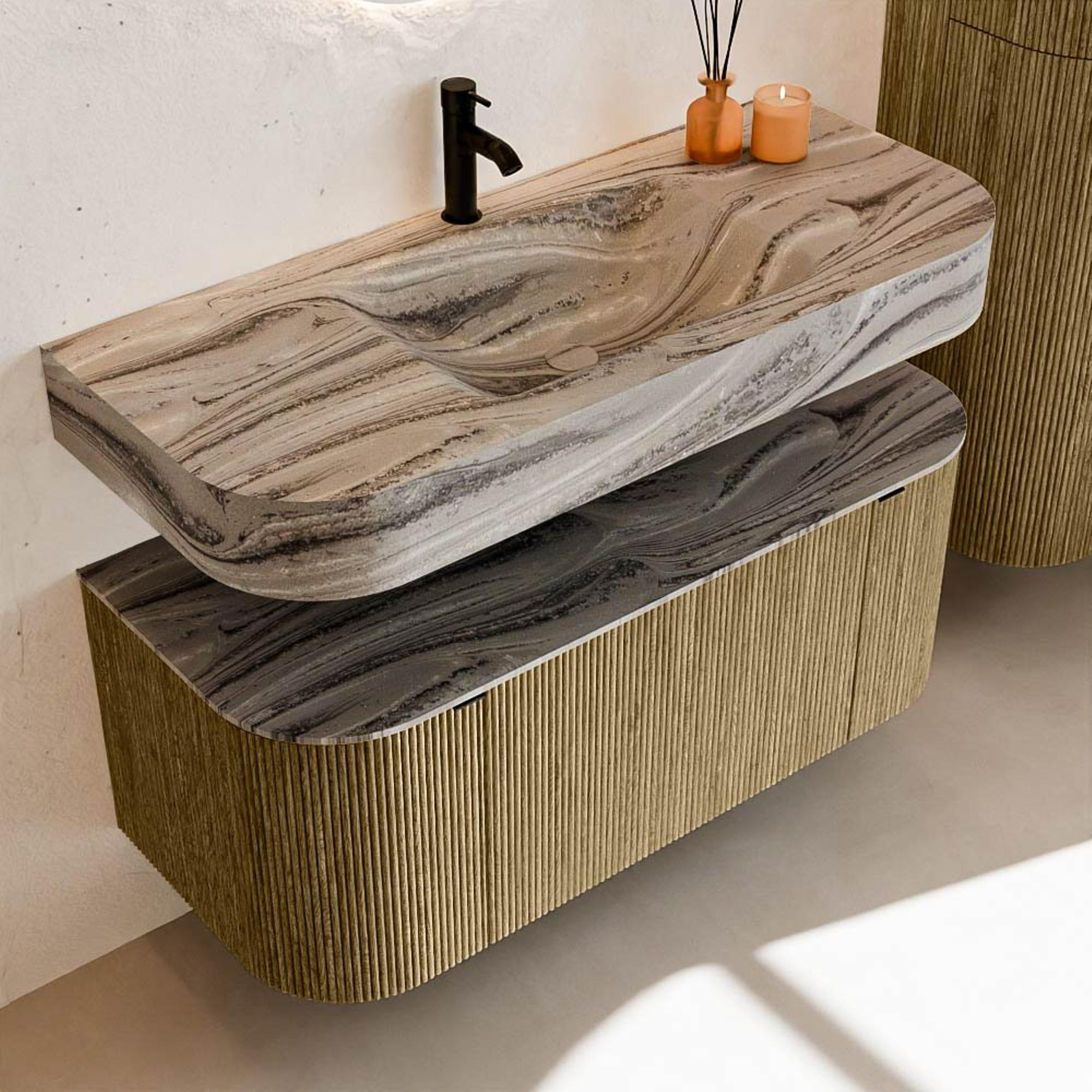 Matériaux naturels dans des tons chauds. Les nervures verticales apportent rythme et texture au design, tandis que le chêne confère une apparence chaleureuse et artisanale. Choisissez parmi 5 teintes de bois OAK, WALNUT, DUSK, SHADOW et RUBY, des couleurs de bois soigneusement sélectionnées pour enrichir les salles de bains modernes et classiques.