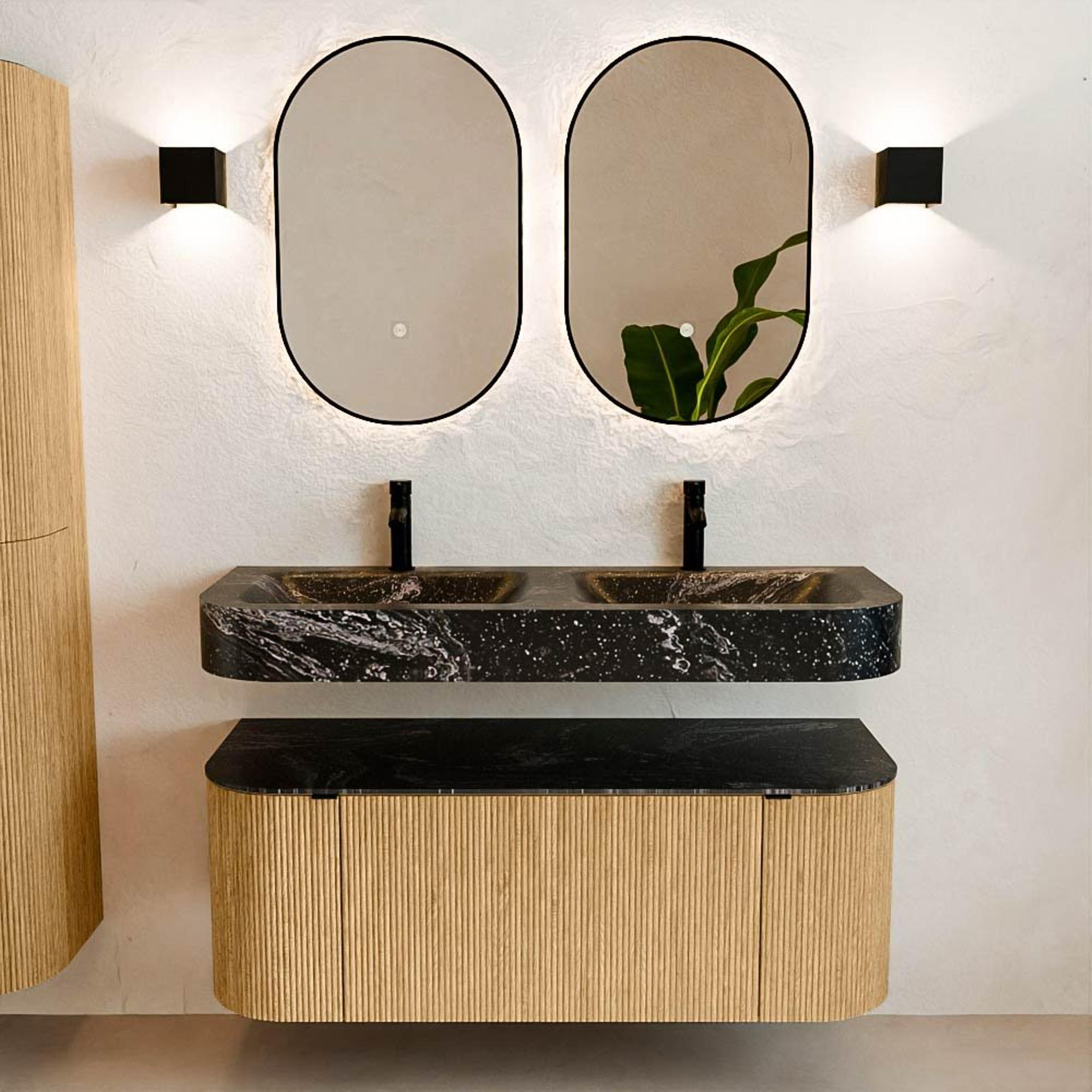 MONDIAZ THOR-DLUX 120cm meuble de salle de bains arrondi gauche + droite couleur Oak avec 1 tiroir et 2 portes. Vasque suspendue CLOUD Double 2 trous de robinet couleur Lava.