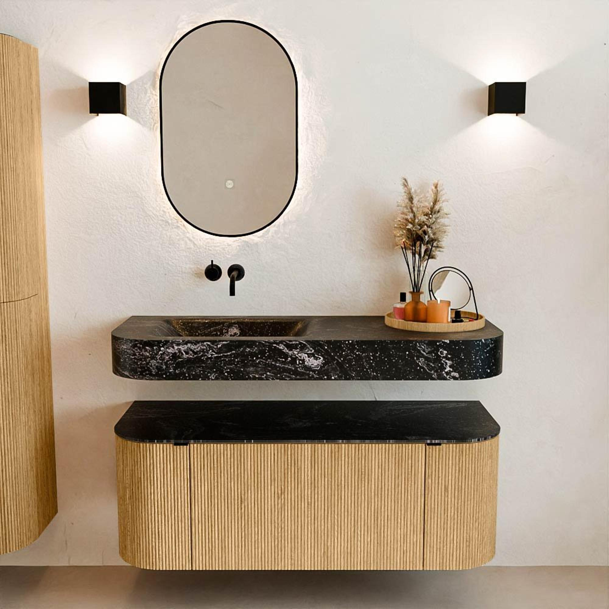 MONDIAZ THOR-DLUX 120cm meuble de salle de bains arrondi gauche + droite couleur Oak avec 1 tiroir et 2 portes. Vasque suspendue CLOUD Gauche sans trou de robinet couleur Lava.