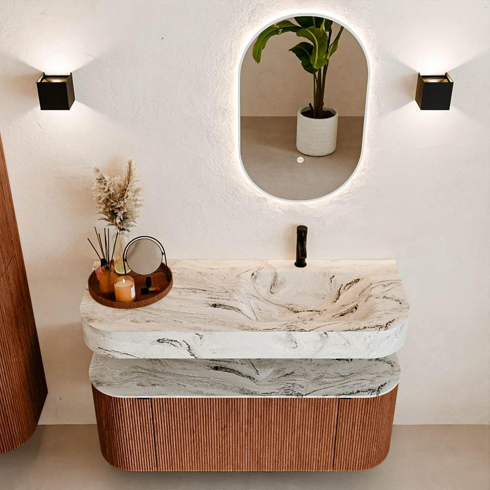 Matériaux naturels dans des tons chauds. Les cannelures verticales apportent rythme et texture au design, tandis que le chêne confère une apparence chaleureuse et artisanale. Choisissez parmi 5 teintes de bois OAK, WALNUT, DUSK, SHADOW et RUBY, des couleurs de bois soigneusement sélectionnées pour enrichir les salles de bains modernes et classiques.