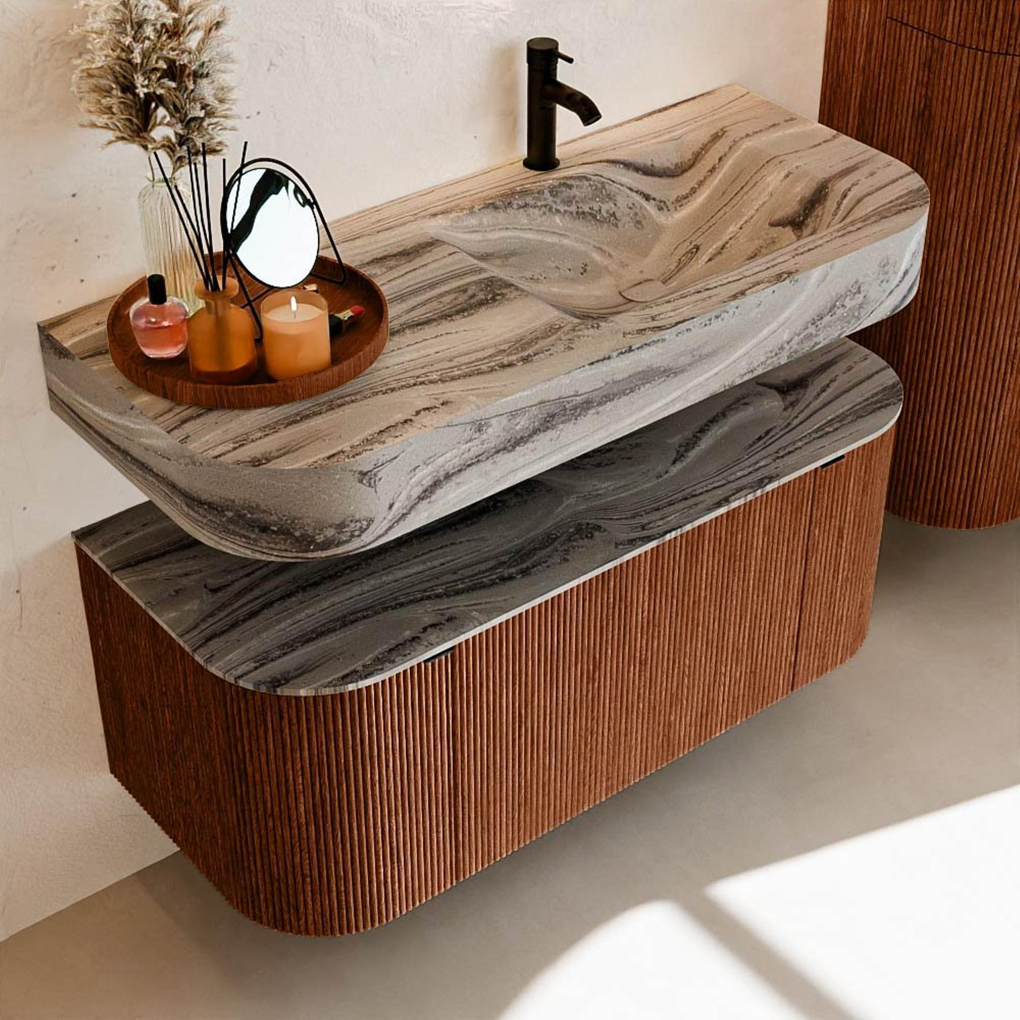 Matériaux naturels dans des tons chauds. Les nervures verticales apportent rythme et texture au design, tandis que le chêne confère une apparence chaleureuse et artisanale. Choisissez parmi 5 teintes de bois OAK, WALNUT, DUSK, SHADOW et RUBY, des couleurs de bois soigneusement sélectionnées pour enrichir les salles de bains modernes et classiques.