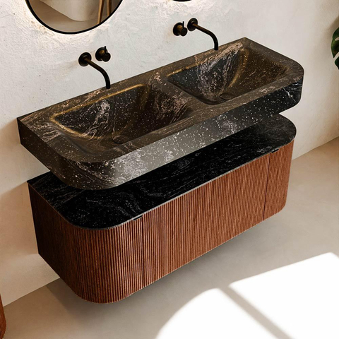 MONDIAZ THOR-DLUX 120cm meuble de salle de bains arrondi gauche + droite couleur Ruby avec 1 tiroir et 2 portes. Vasque suspendue CLOUD Double sans trou de robinet couleur Lava.