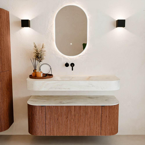 Au-dessus du meuble flotte une vasque suspendue assortie aux coins arrondis – parfaitement adaptée à la forme du meuble. La vasque est réalisée en Solid Surface et suit subtilement les lignes du meuble inférieur, créant ainsi un ensemble harmonieux. Le plan de travail en Solid Surface forme une base solide, facile d'entretien et complète la combinaison.