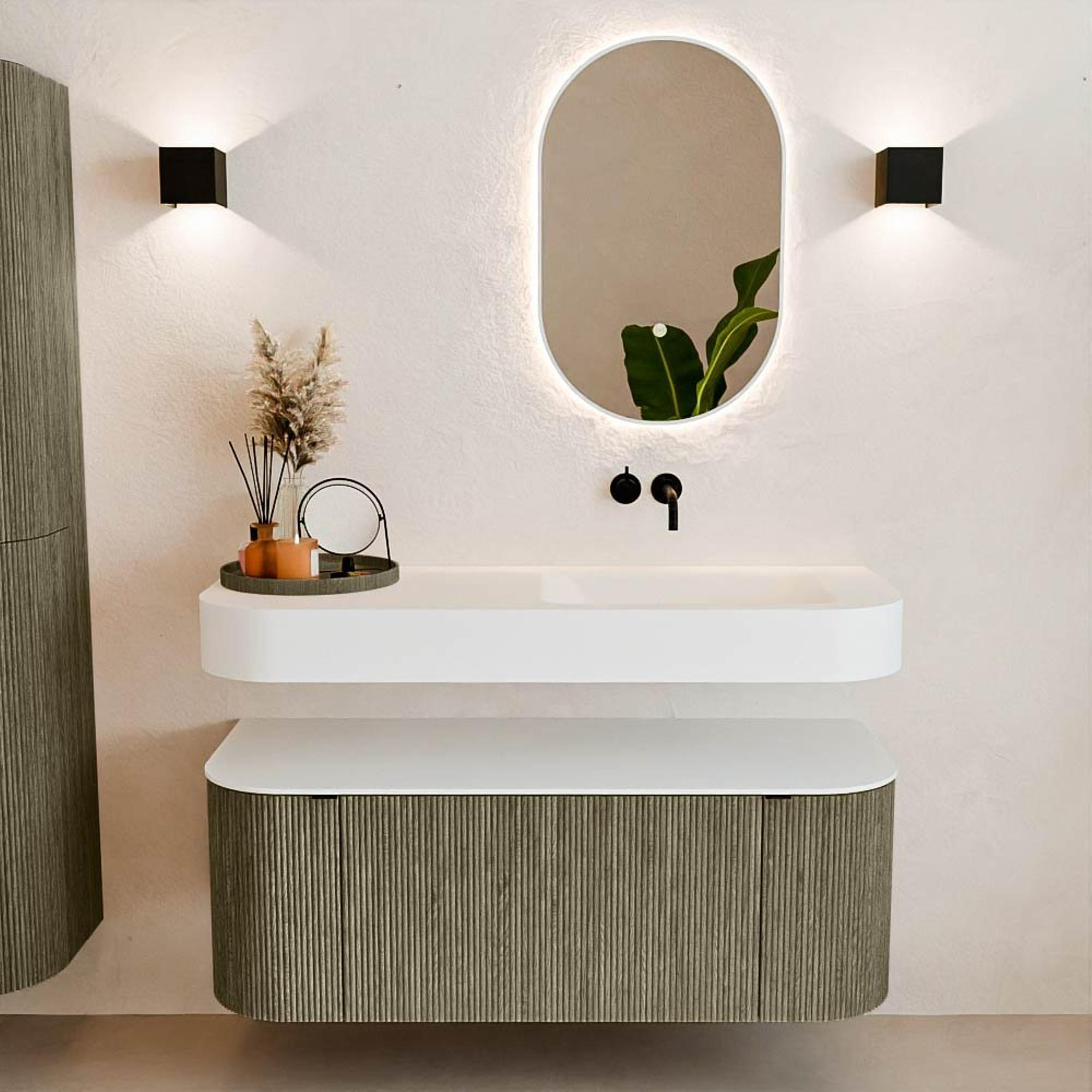 Au-dessus du meuble flotte une vasque suspendue assortie aux coins arrondis – parfaitement adaptée à la forme du meuble. La vasque est en Solid Surface et suit subtilement les lignes du meuble inférieur, créant ainsi un ensemble harmonieux. Le plan de travail en Solid Surface constitue une base solide et facile d'entretien, complétant la combinaison.