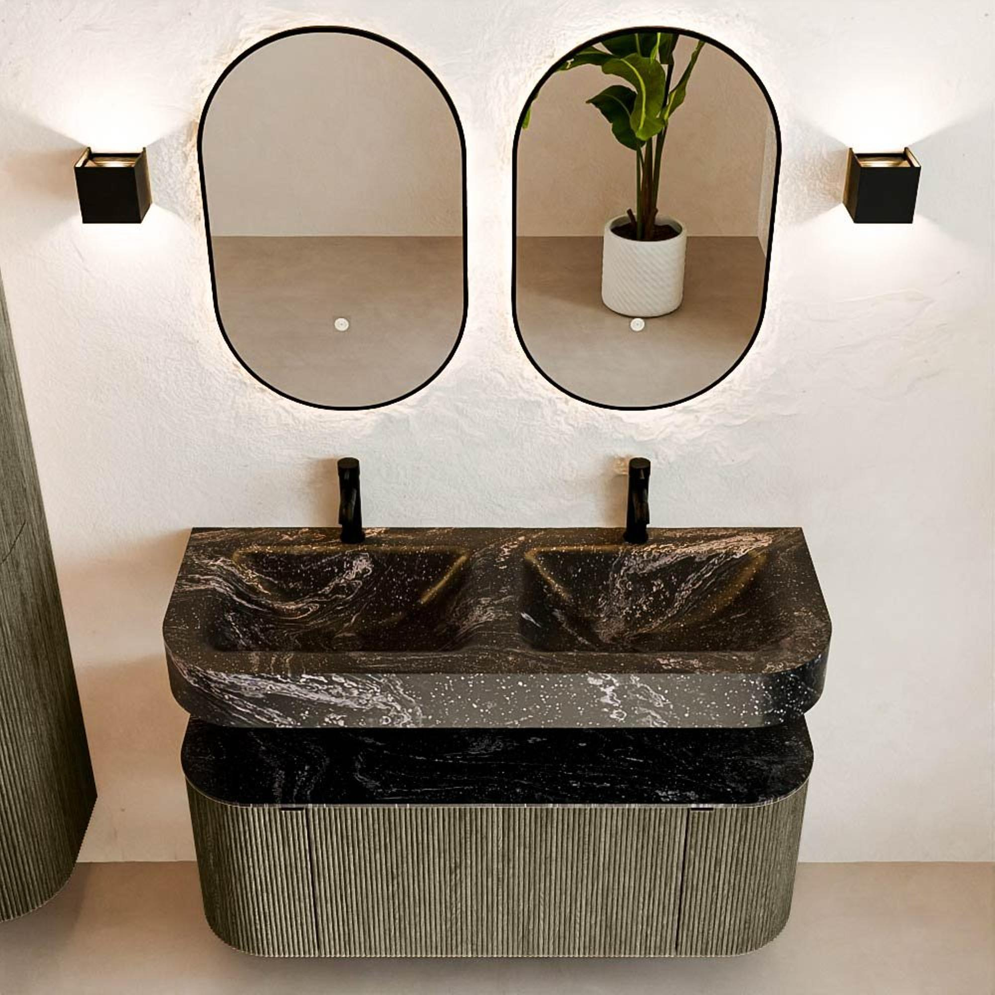 MONDIAZ THOR-DLUX 120cm meuble de salle de bains arrondi gauche + droite couleur Shadow avec 1 tiroir et 2 portes. Vasque suspendue CLOUD Double 2 trous de robinet couleur Lava.