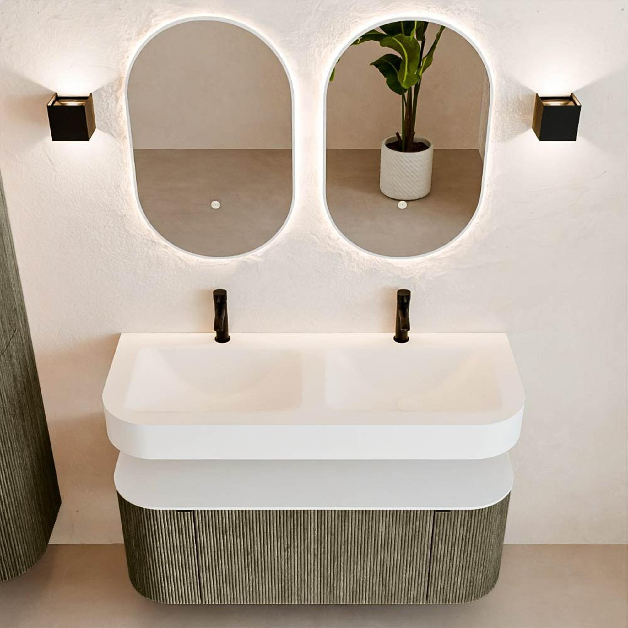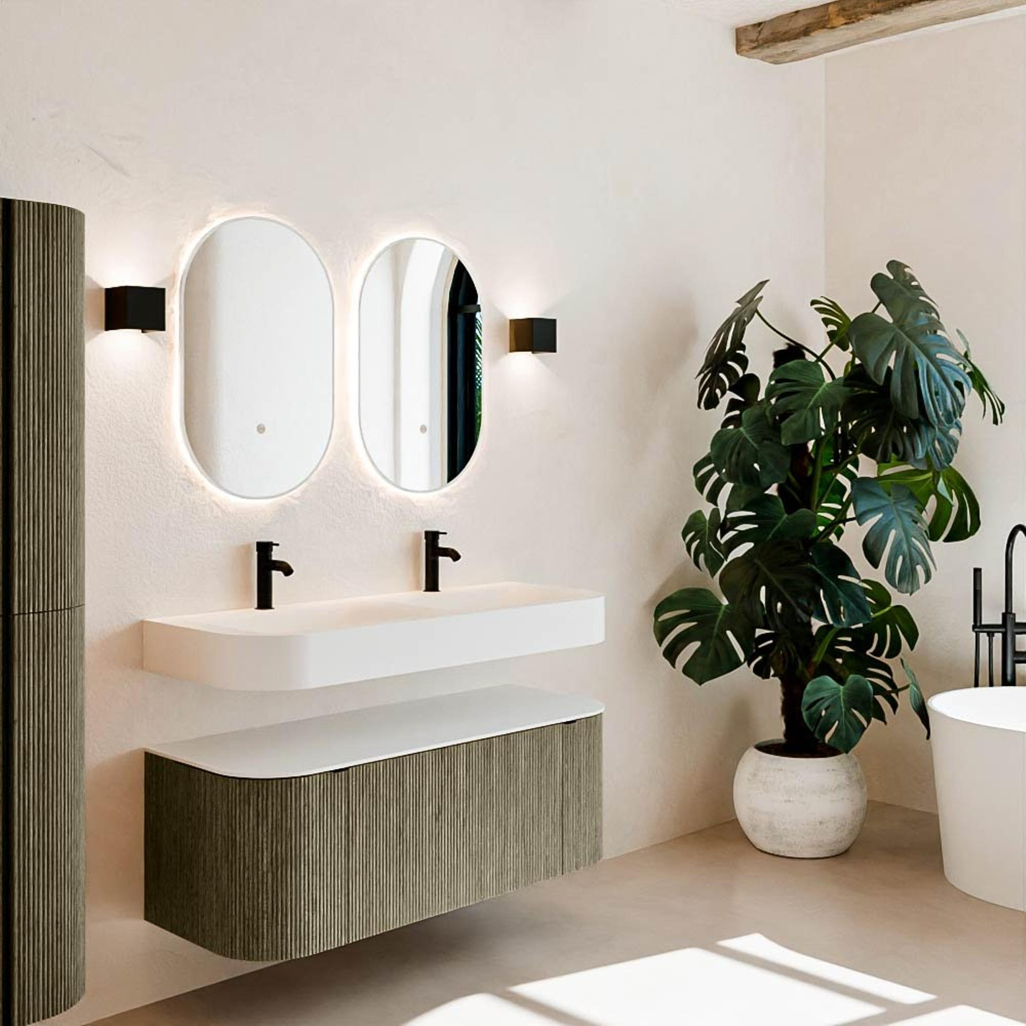Matériaux naturels dans des tons chauds. Les rainures verticales apportent rythme et texture au design, tandis que le chêne confère une apparence chaleureuse et artisanale. Choisissez parmi 5 teintes de bois OAK, WALNUT, DUSK, SHADOW et RUBY, des couleurs de bois soigneusement sélectionnées pour enrichir les salles de bains modernes et classiques.