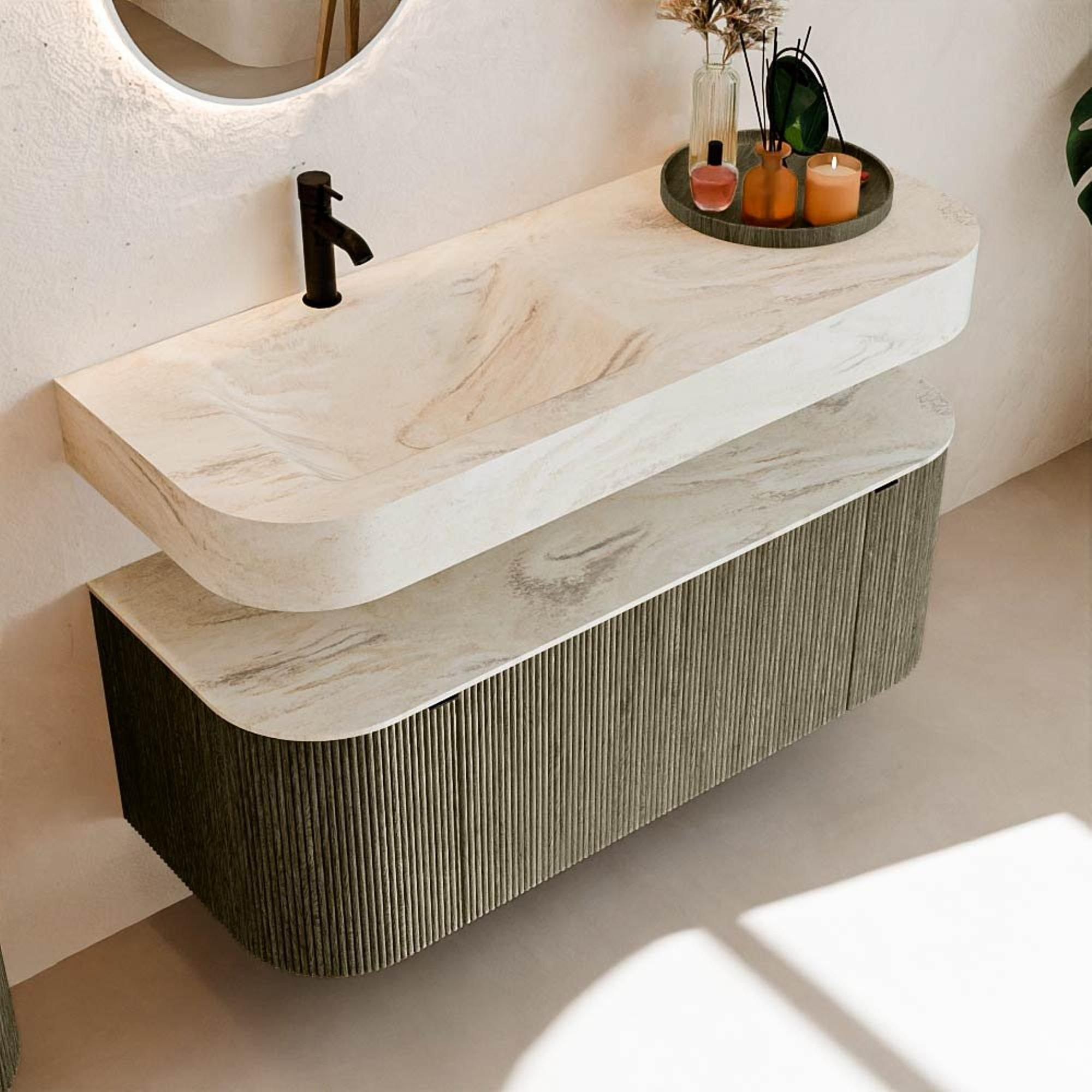 MONDIAZ THOR-DLUX 120cm meuble de salle de bains arrondi gauche + droite couleur Shadow avec 1 tiroir et 2 portes. Vasque suspendue CLOUD Gauche 1 trou de robinet couleur Ostra.