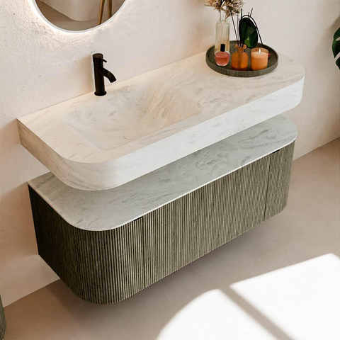 Au-dessus du meuble flotte une vasque suspendue assortie aux coins arrondis – parfaitement adaptée à la forme du meuble. La vasque est réalisée en Solid Surface et suit subtilement les lignes du meuble inférieur, créant ainsi un ensemble harmonieux. Le plan de travail en Solid Surface constitue une base solide et facile d'entretien, complétant la combinaison.
