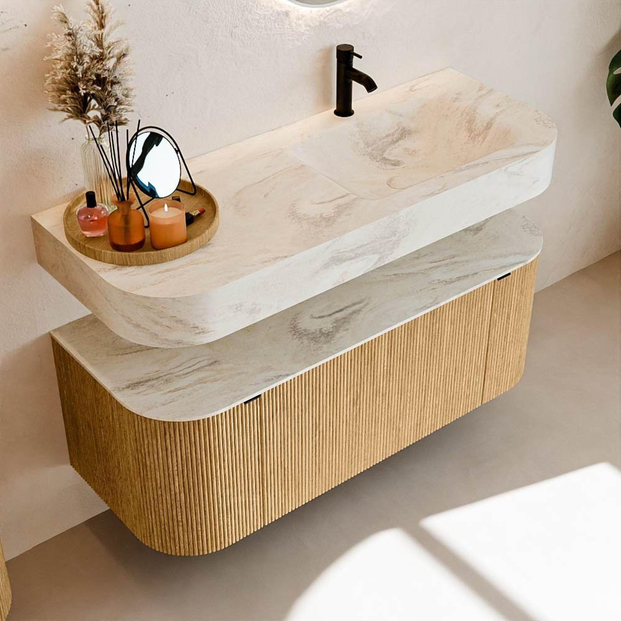 MONDIAZ THOR-DLUX 120cm meuble de salle de bains arrondi gauche + droite couleur Oak avec 1 tiroir et 2 portes. Vasque suspendue CLOUD Droite 1 trou de robinet couleur Ostra.