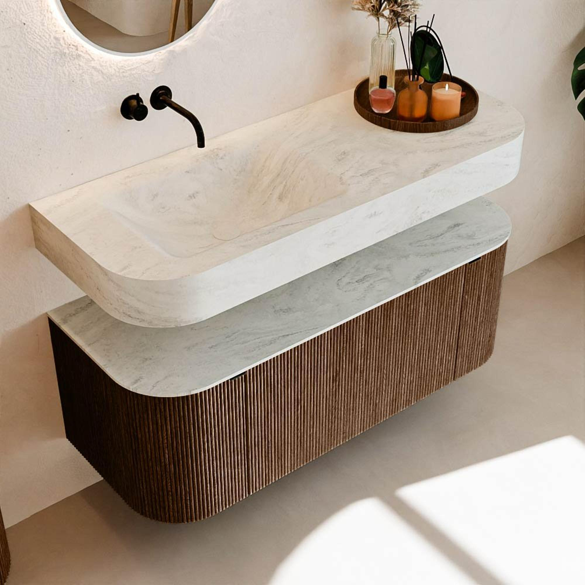Au-dessus du meuble flotte une vasque suspendue assortie aux coins arrondis – parfaitement adaptée à la forme du meuble. La vasque est en Solid Surface et suit subtilement les lignes du meuble inférieur, créant un ensemble harmonieux. Le plan de travail en Solid Surface forme une base solide, facile d'entretien, et complète la combinaison.