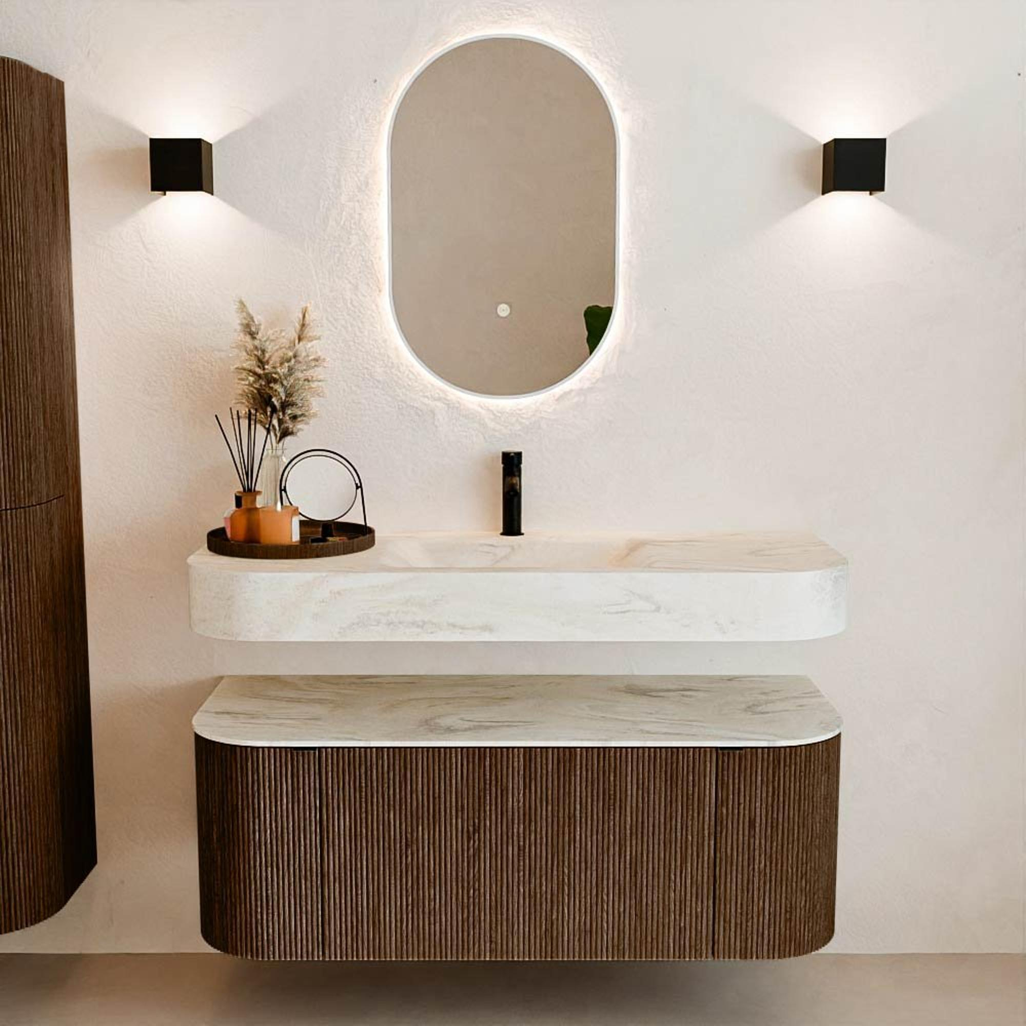 Matériaux naturels dans des tons chauds. Les cannelures verticales apportent rythme et texture au design, tandis que le chêne confère une apparence chaleureuse et artisanale. Choisissez parmi 5 teintes de bois OAK, WALNUT, DUSK, SHADOW et RUBY, des couleurs de bois soigneusement sélectionnées pour enrichir les salles de bains modernes et classiques.