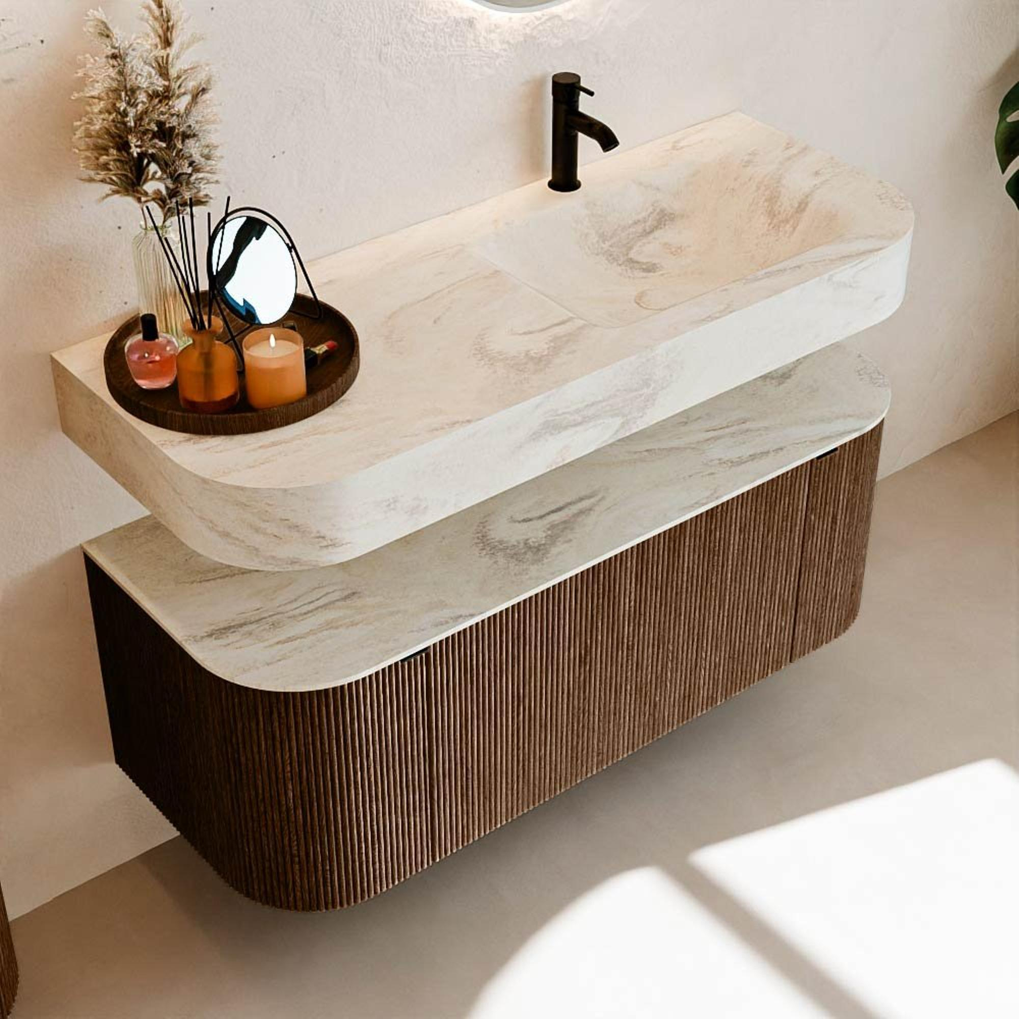 MONDIAZ THOR-DLUX 120cm meuble de salle de bains arrondi gauche + droite couleur Walnut avec 1 tiroir et 2 portes. Vasque suspendue CLOUD Droite 1 trou de robinet couleur Ostra.