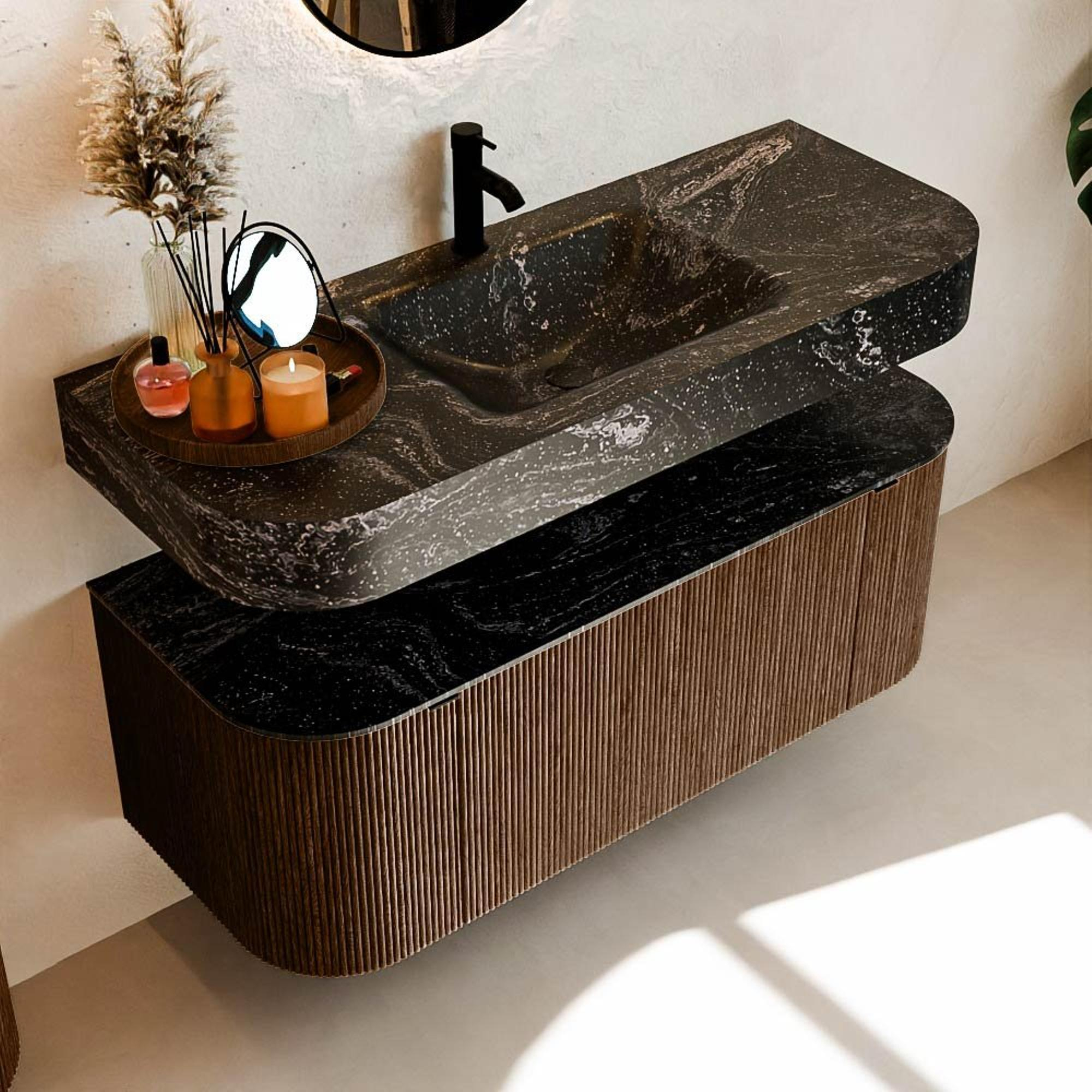 MONDIAZ THOR-DLUX 120cm meuble de salle de bains arrondi gauche + droite couleur Walnut avec 1 tiroir et 2 portes. Vasque suspendue CLOUD Milieu 1 trou de robinet couleur Lava.