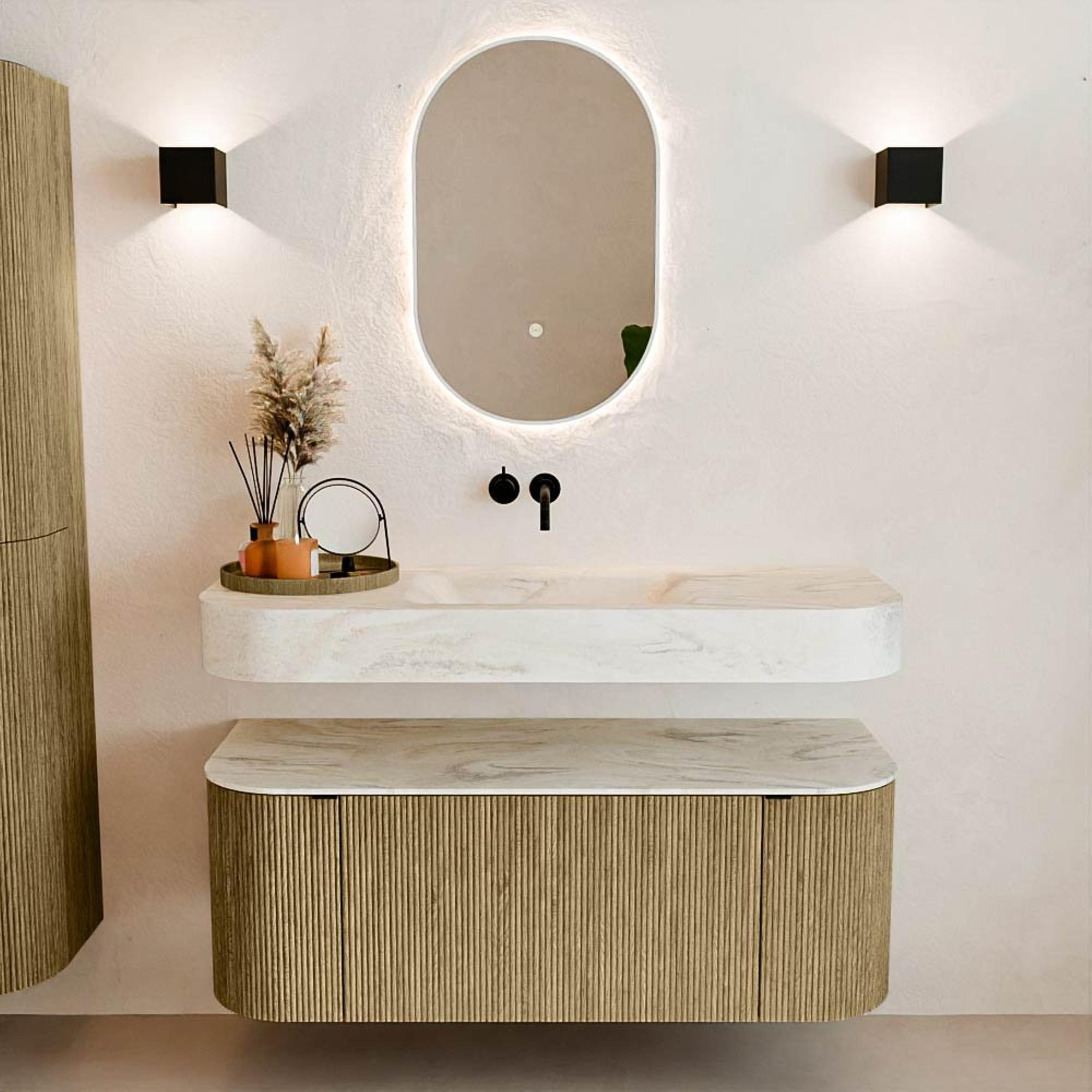 Matériaux naturels dans des tons chauds. Les nervures verticales apportent rythme et texture au design, tandis que le chêne confère une apparence chaleureuse et artisanale. Choisissez parmi 5 teintes de bois OAK, WALNUT, DUSK, SHADOW et RUBY, des couleurs de bois soigneusement sélectionnées pour enrichir les salles de bains modernes et classiques.