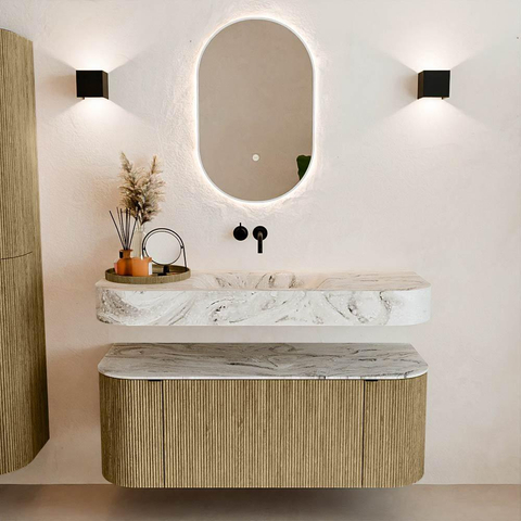 Matériaux naturels dans des tons chauds. Les nervures verticales apportent rythme et texture au design, tandis que le chêne confère une apparence chaleureuse et artisanale. Choisissez parmi 5 teintes de bois OAK, WALNUT, DUSK, SHADOW et RUBY, des couleurs de bois soigneusement sélectionnées pour enrichir les salles de bains modernes et classiques.