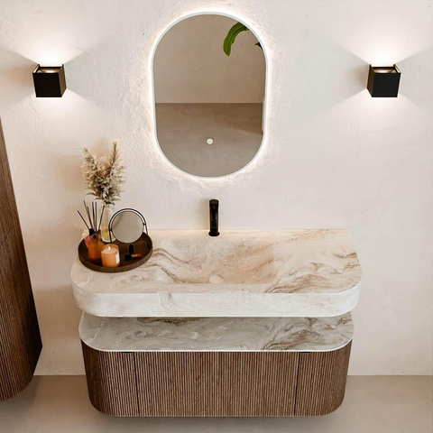Matériaux naturels dans des tons chauds. Les cannelures verticales apportent rythme et texture au design, tandis que le chêne confère une apparence chaleureuse et artisanale. Choisissez parmi 5 teintes de bois OAK, WALNUT, DUSK, SHADOW et RUBY, des couleurs de bois soigneusement sélectionnées pour enrichir les salles de bains modernes et classiques.