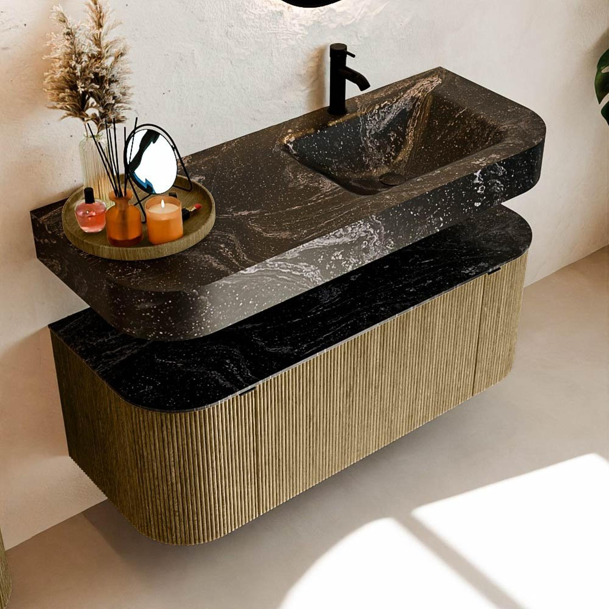 Matériaux naturels dans des tons chauds. Les nervures verticales apportent rythme et texture au design, tandis que le chêne confère une apparence chaleureuse et artisanale. Choisissez parmi 5 teintes de bois OAK, WALNUT, DUSK, SHADOW et RUBY, des couleurs de bois soigneusement sélectionnées pour enrichir les salles de bains modernes et classiques.