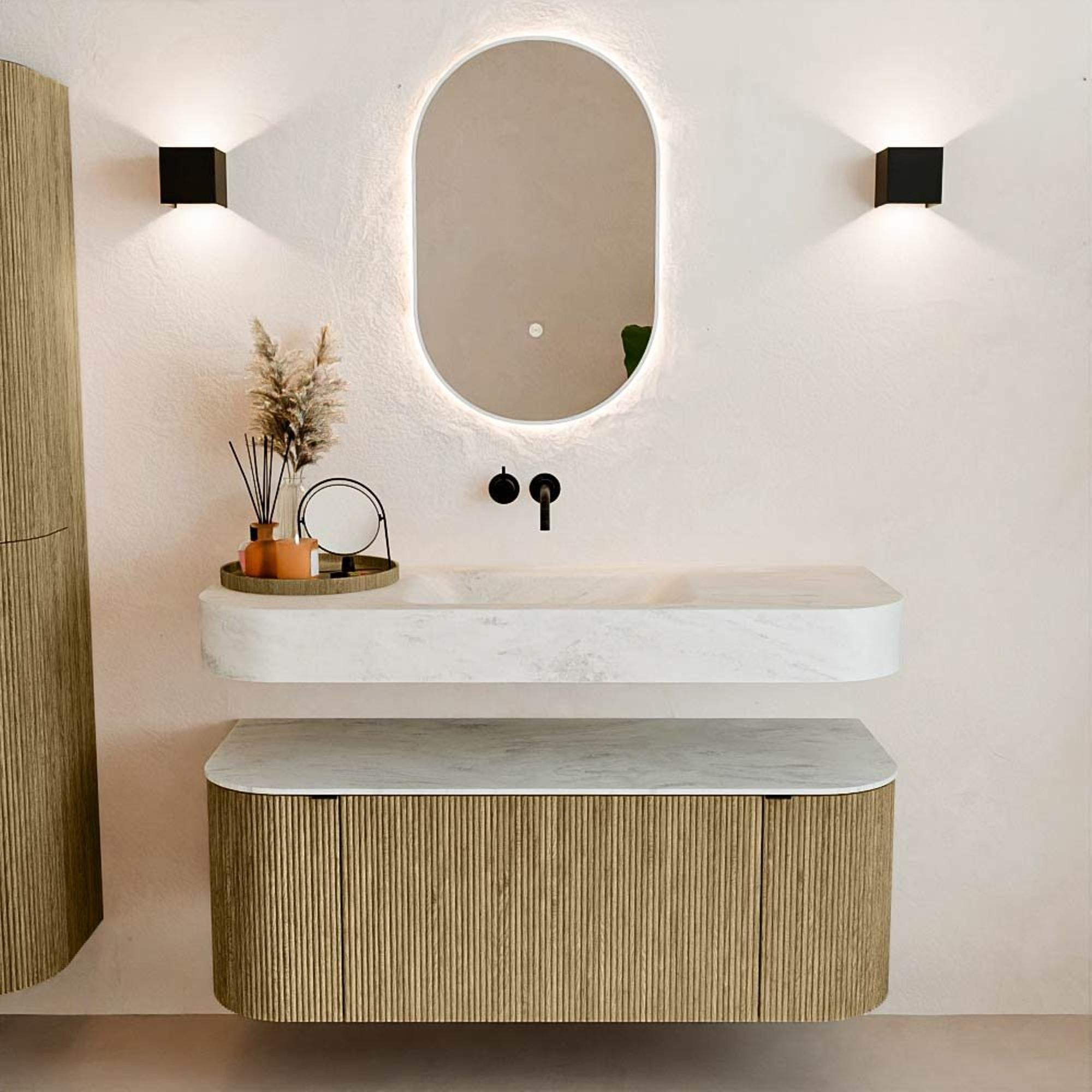Matériaux naturels aux teintes chaudes. Les nervures verticales apportent rythme et texture au design, tandis que le chêne confère une apparence chaleureuse et artisanale. Choisissez parmi 5 teintes de bois OAK, WALNUT, DUSK, SHADOW et RUBY, des couleurs de bois soigneusement sélectionnées pour enrichir les salles de bains modernes et classiques.