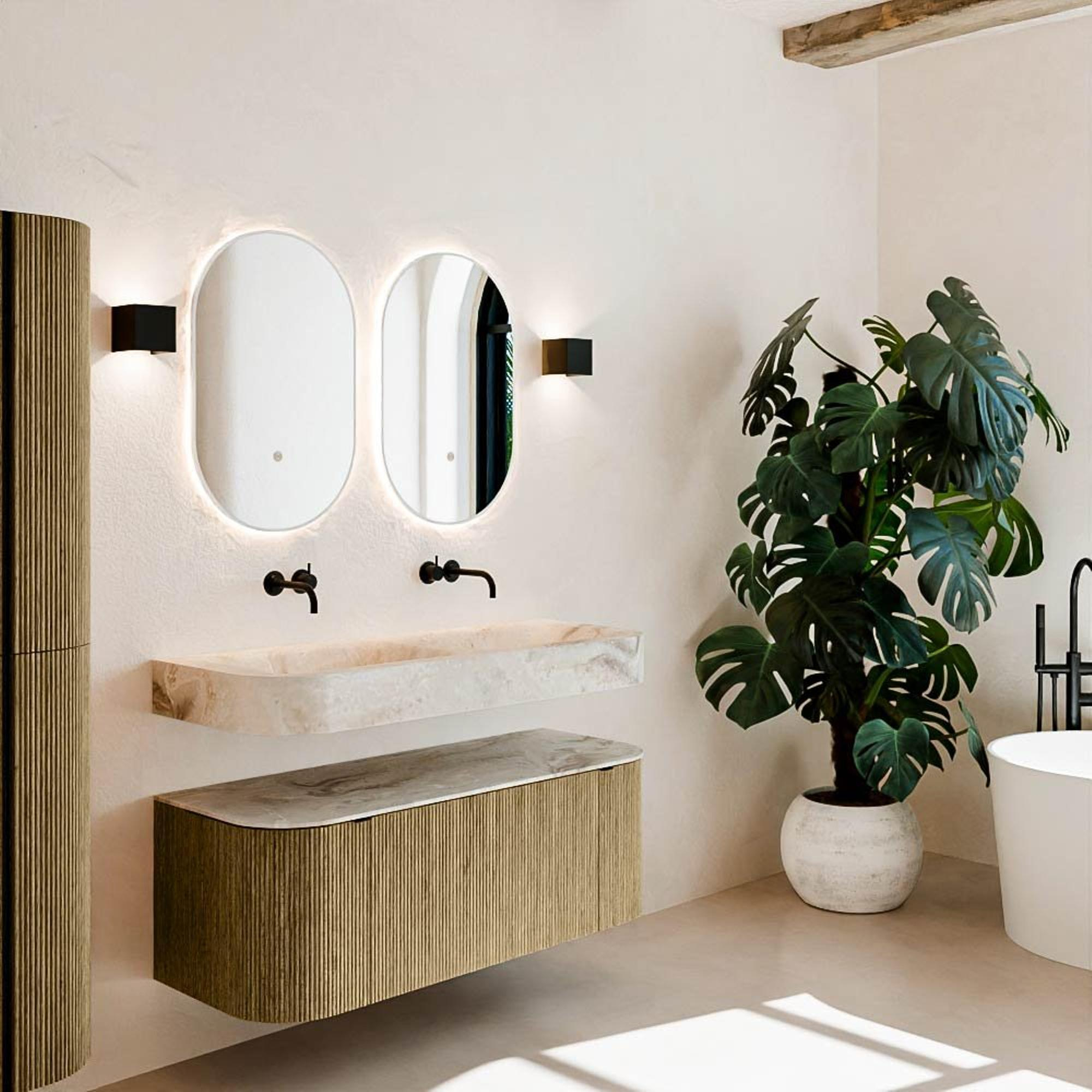 Matériaux naturels dans des tons chauds. Les cannelures verticales apportent rythme et texture au design, tandis que le chêne confère une apparence chaleureuse et artisanale. Choisissez parmi 5 teintes de bois OAK, WALNUT, DUSK, SHADOW et RUBY, des couleurs de bois soigneusement sélectionnées pour enrichir les salles de bains modernes et classiques.