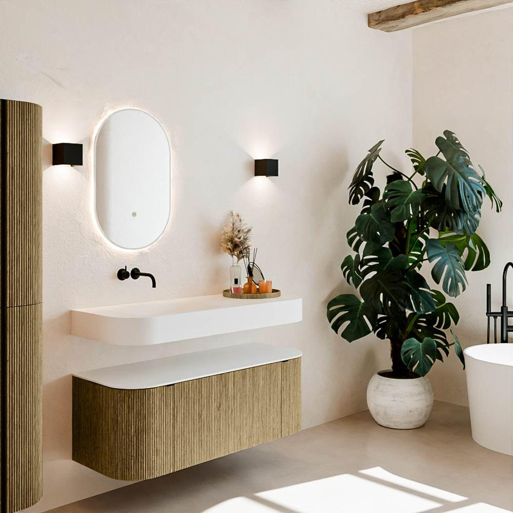 Matériaux naturels dans des tons chauds. Les nervures verticales apportent rythme et texture au design, tandis que le chêne confère une apparence chaleureuse et artisanale. Choisissez parmi 5 teintes de bois OAK, WALNUT, DUSK, SHADOW et RUBY, des couleurs de bois soigneusement sélectionnées pour enrichir les salles de bains modernes et classiques.