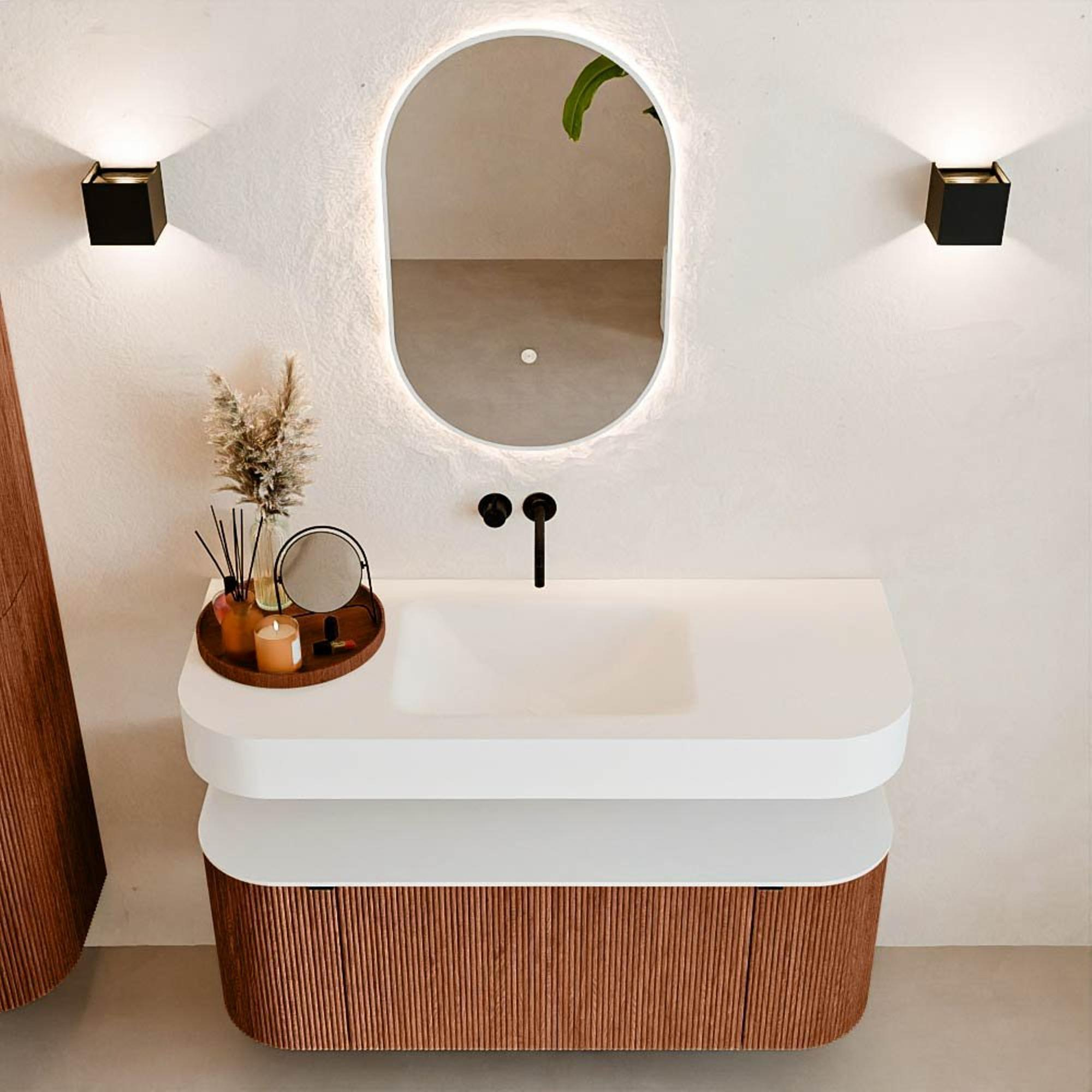 Au-dessus du meuble flotte une vasque suspendue assortie aux coins arrondis – parfaitement adaptée à la forme du meuble. La vasque est réalisée en Solid Surface et suit subtilement les lignes du meuble inférieur, créant ainsi un ensemble harmonieux. Le plan de travail en Solid Surface forme une base solide et facile d'entretien et complète la combinaison.